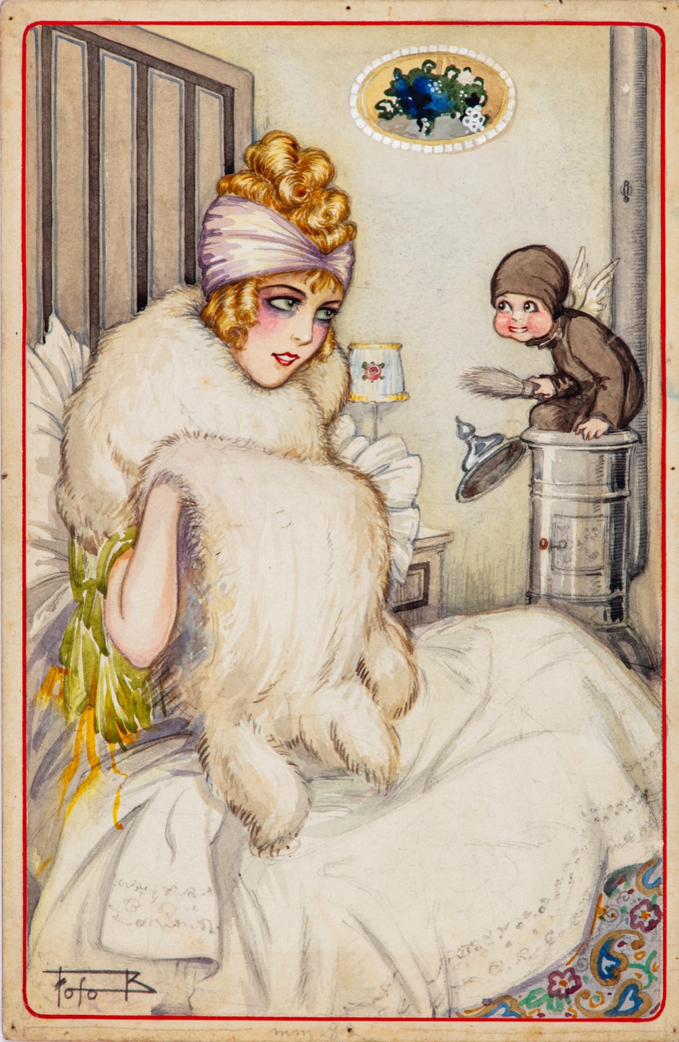 Illustrazione originale realizzata da Busi durante gli anni '20 per una delle sue celebri cartoline. Pittore, cartellonista e illustratore, Busi si diplomò all'Accademia di Belle Arti di Bologna. Nel 1914 partecipò alla II Mostra della Secessione Romana con Morandi e Corsi. Verso la fine degli anni Venti iniziò una lunga collaborazione con le Officine Grafiche Ricordi, divenendo uno dei più raffinati cartellonisti italiani. Intensa fu anche la sua attività di illustratore di favole e cartoline di soggetto patriottico o galante/mondano (auguri, ricorrenze, corrispondenza amorosa), tutti dominati dalla presenza di "donnine" piacevoli e sorridenti, ben modellate, ariose nei loro aggraziati movimenti, esenti però da quella "malizia" che caratterizzava molti suoi colleghi del tempo. Fori di affissione ai margini. Firmata.