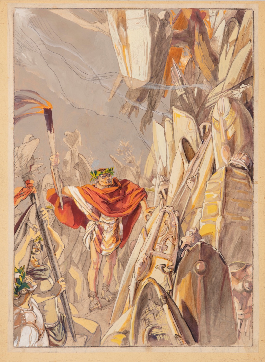 Illustrazione originale realizzata da Cambellotti tra il 1936 e il 1938 per "I grandi condottieri italiani", opera probabilmente rimasta inedita. Cambellotti si accostò inizialmente all‘Art Nouveau, accogliendone però gli aspetti prettamente originari e pionieristici espressi dalle idee di William Morris, per poi avvicinarsi al futurismo. Egli, come Morris, vide nell‘arte una finalità sociale, globale, moralistica, pedagogica al fine di renderla fruibile a tutti e, come l‘artista inglese, divenne l‘esempio lampante di artista-artigiano per eccellenza. Considerato uno degli esempi più fulgidi in Italia dell‘Art Nouveau, Cambellotti fu pittore, scultore, ceramista, scenografo, designer, architetto e incisore, ma è forse nell‘illustrazione che confluirono tutte le istanze artistiche alle quali si avvicinò nel corso della propria carriera. Opera archiviata nell‘Archivio Cambellotti con il n. 914.