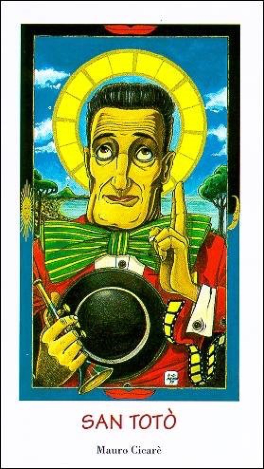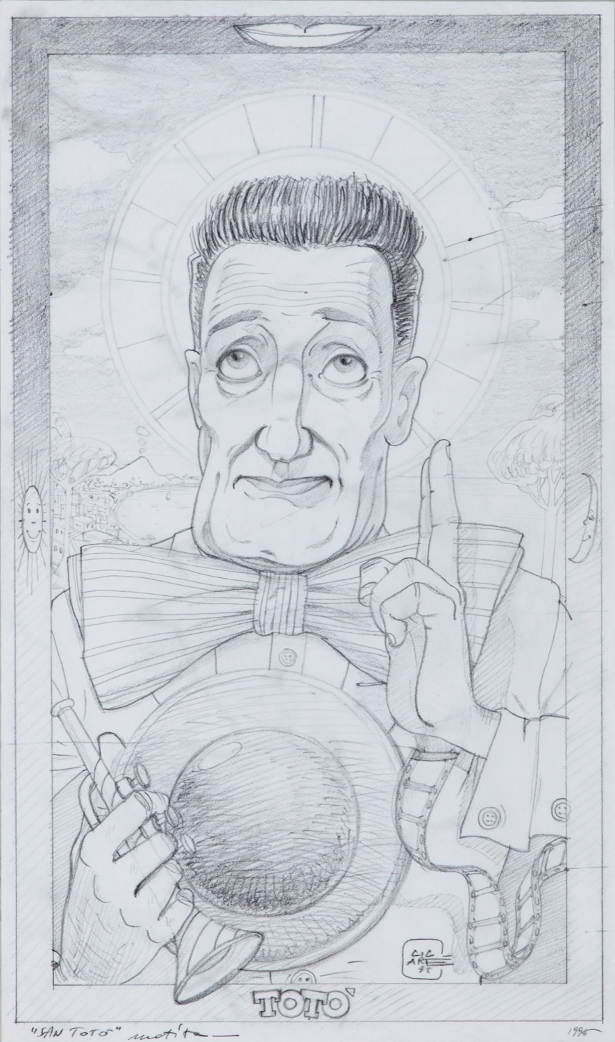 Disegno realizzato da Cicarè in occasione della mostra "San Totò... mira il tuo popolo", tenutasi a Grottammare nel 1995. Per questa occasione furono realizzati 24 santini raffiguranti il Principe della risata da altrettanti artisti di fama internazionale. Firmato e datato.