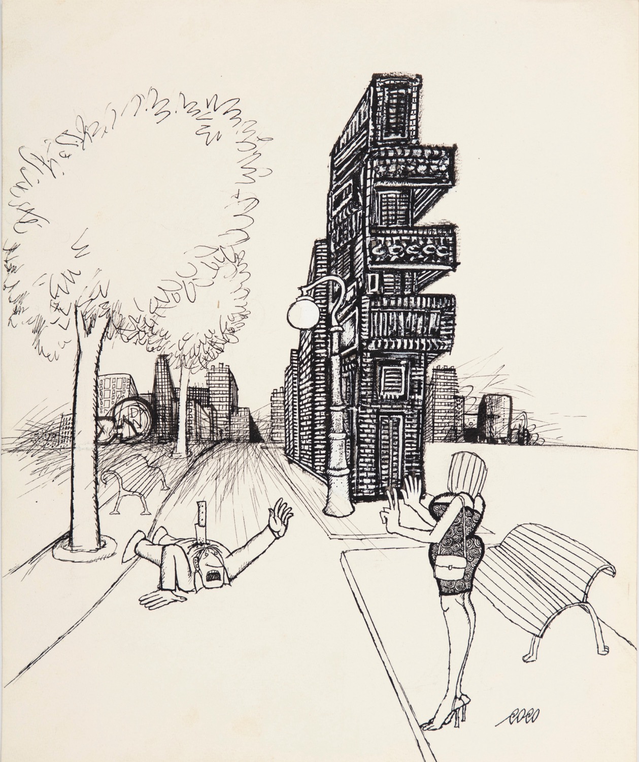 Illustrazione originale realizzata da Coco durante gli anni '70 per la rivista Playmen. Celebre disegnatore umoristico, Coco ha collaborato con periodici italiani come Amica, Comix, Corriere della Sera, La Settimana Enigmistica, mentre nel mondo ha pubblicato su Bazar, El Pas, Paris Match, Punch, e The Saturday Evening Post, divenendo uno dei massimi esponenti italiani dellhumor nero. Firmata al fronte, firmata e dedicata al retro.