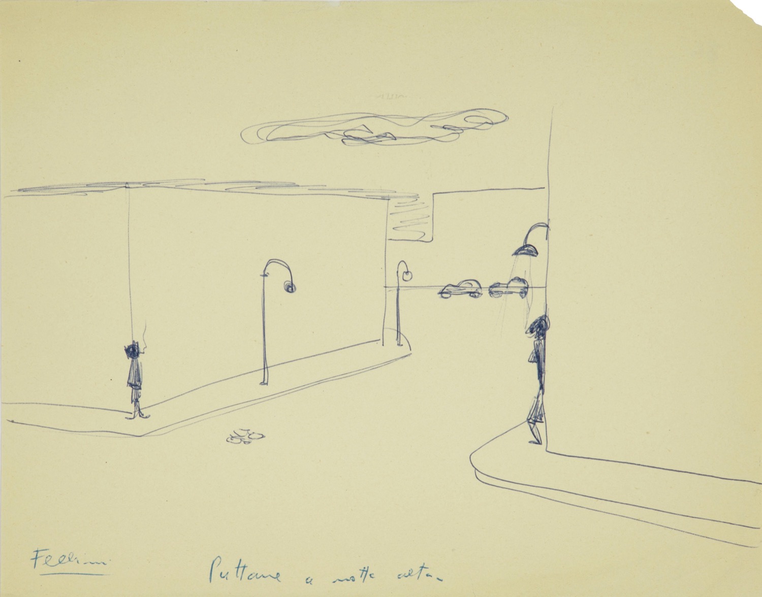 Disegno originale realizzato da Fellini negli anni '50 probabilmente durante la realizzazione del celebre film "Le notti di Cabiria" del 1957. Opera pubblicata nel volume "Federico Fellini: La mia Rimini" a pag. 116 da Guaraldi Editore nel 2003. L'espressione più immediata della straordinaria fantasia di Federico Fellini è sempre stata il disegno, sia durante la preparazione dei film, sia in quei momenti più intimi, spensierati e quindi gioiosi in cui, scaricatosi di tutte le energie creative, si tuffava in quelle più distensive e liberatorie che gli suggeriva il disegno. Piccola mancanza all'angolo superiore destro, lievi pieghe e piccoli strappi ai margini. Firmato e titolato.