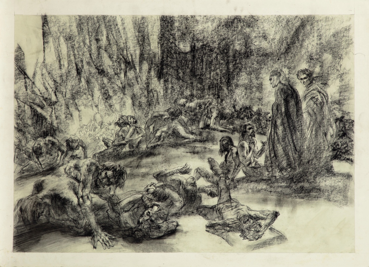 Illustrazione originale realizzata dai fratelli Gregori per la celebre edizione della "Divina Commedia" edita dalle Edizioni San Paolo nel 1990. Raffigurato il Canto XXIX dell'Inferno in cui sono puniti i seminatori di discordia e i falsari. Lievi ammaccature agli angoli.