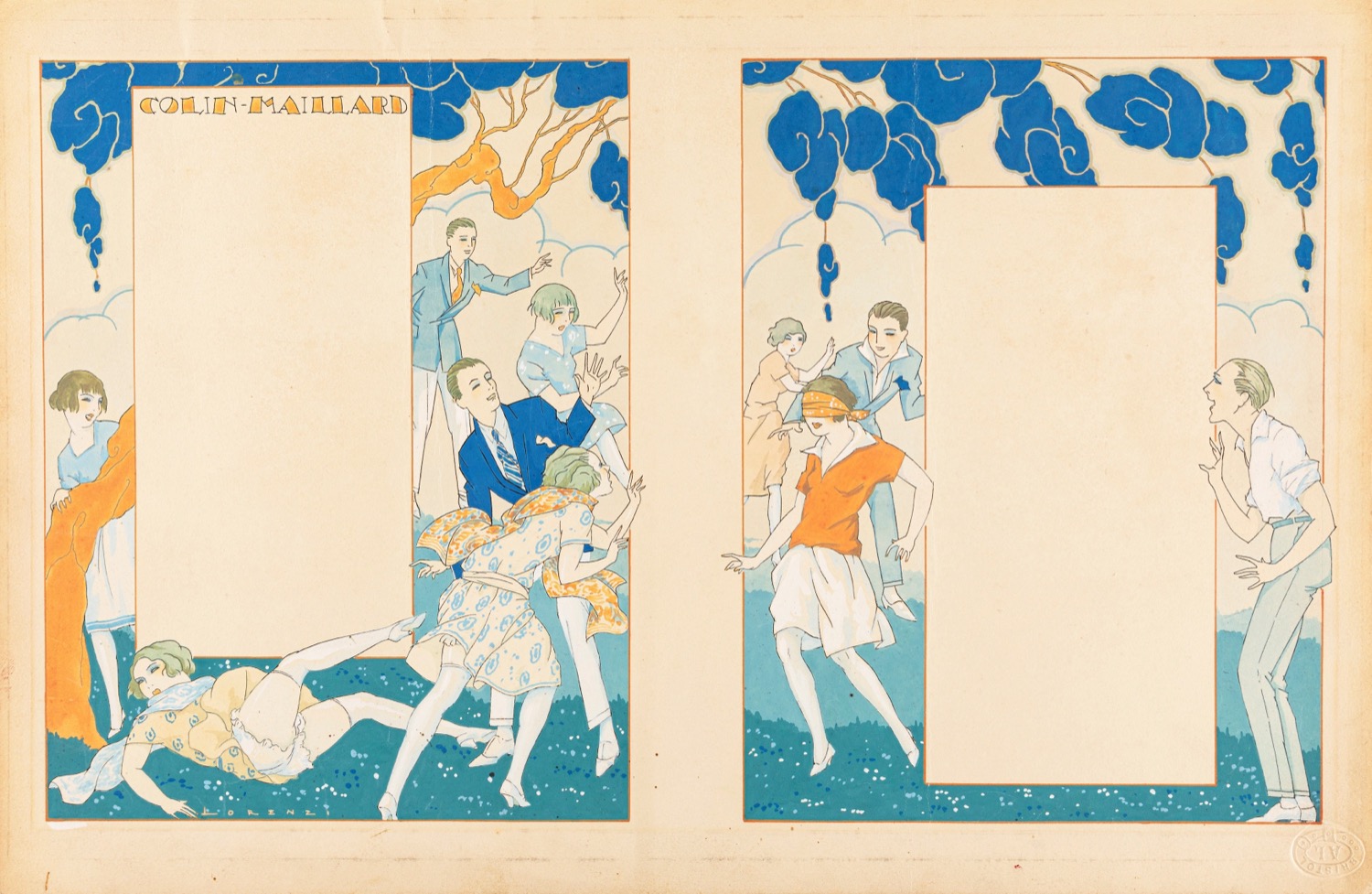 Illustrazione originale realizzate da Lorenzi durante gli anni '20. Opera utilizzata come copertina per il volume "Arti decorative 1895-1930" vol. 3 edito dalla Banca Emiliana nel 1985. Due lievi pieghe verticali al centro. Firmata.