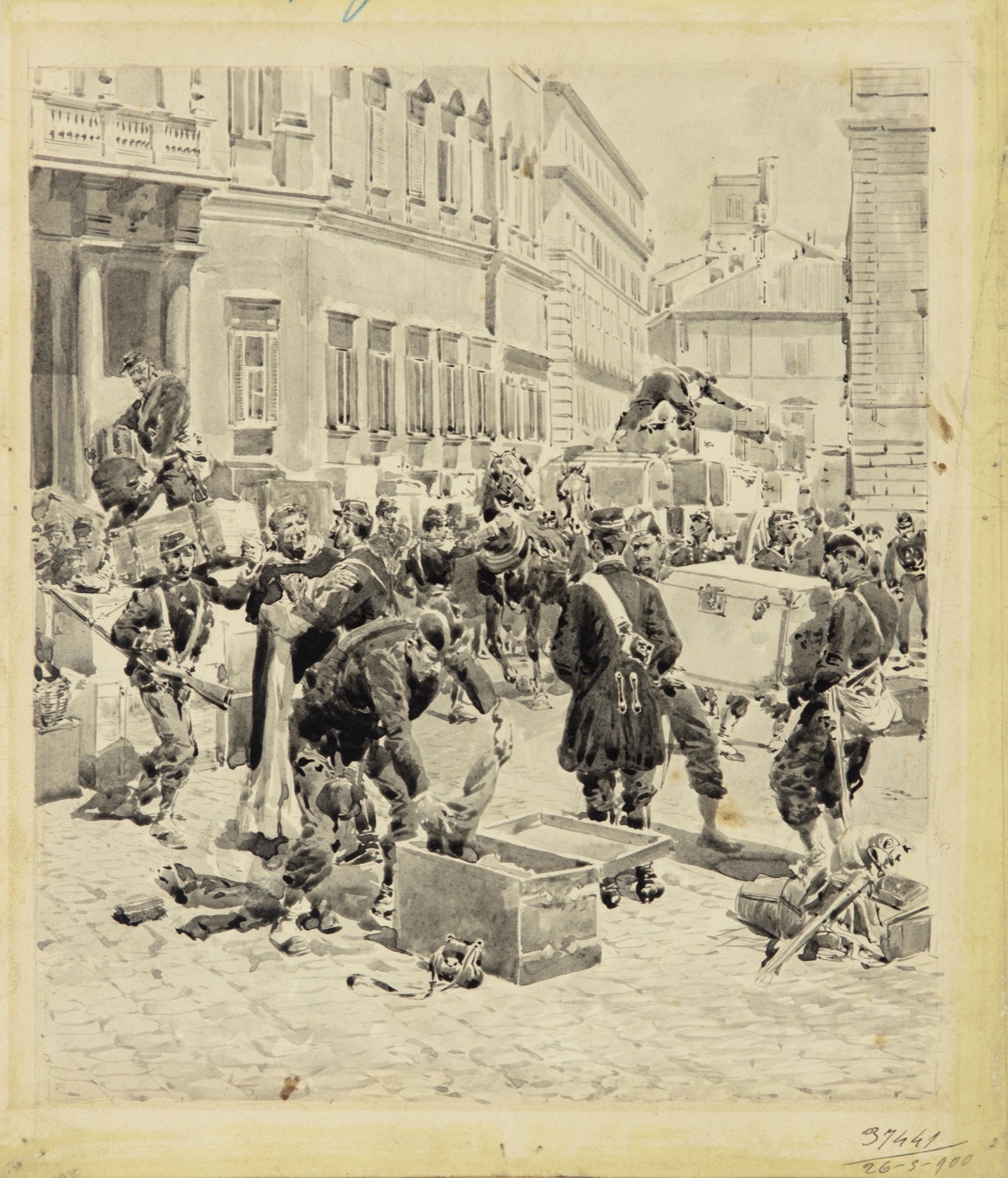 Illustrazione realizzata a quattro mani da Edoardo e Fortunino Matania (padre e figlio) per il celebre volume "La Vita ed il Regno di Vittorio Emanuele II di Savoia Primo Re d'Italia" edito da Treves nel 1901. L'intero corpus di disegni realizzati per questo volume fù oggetto di una mostra dedicata, tenutasi dal 16 febbraio 1901 alla Galleria nazionale d'arte moderna di Roma. Fori di affissione ai margini.