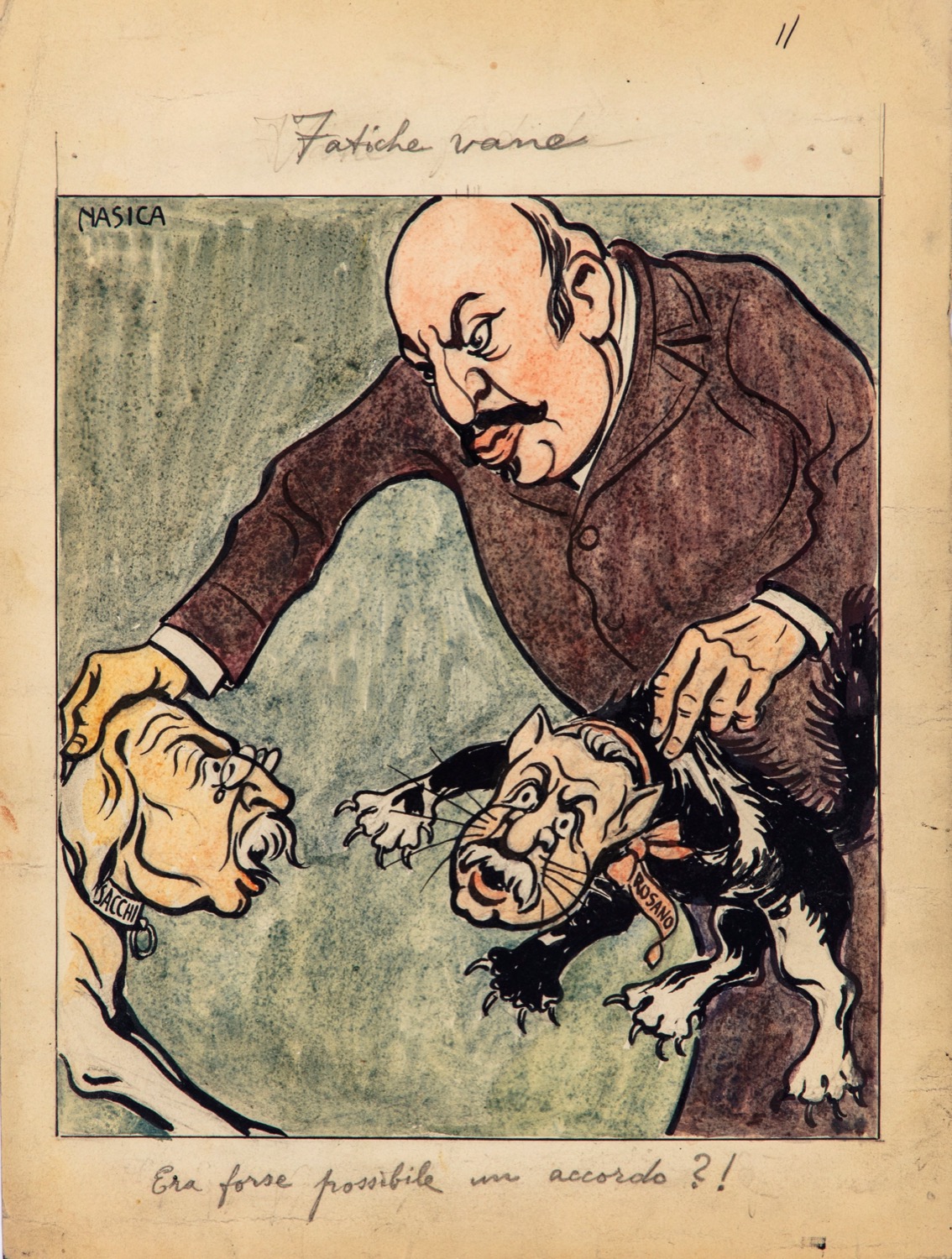 Illustrazione originale realizzata da Nasica durante i primi anni del '900. " Era forse possibile un accordo? ". Maestro all'Accademia di Belle Arti di Bologna di Giorgi Morandi e Bruno Saetti, Nasica fu tra gli illustratori più apprezzati della sua epoca, definito il "caricaturista degli intellettuali", lavorò tra le altre per le riviste Italia ride, Novissima, Fantasio, La Lettura e il Secolo XX. Lievi pieghe ai margini. Firmata.