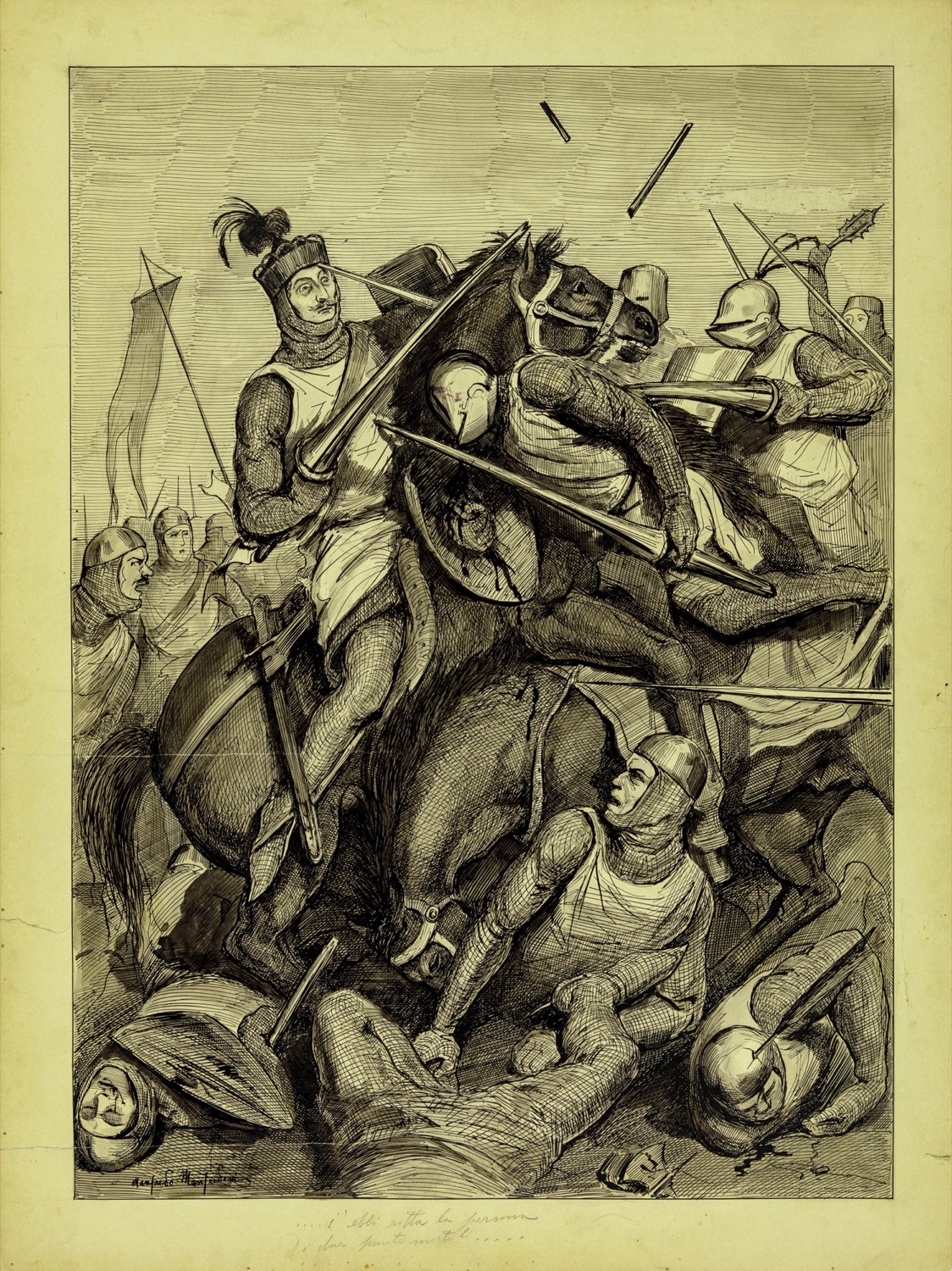 Illustrazione originale realizzata da Manfredini tra il 1904 e il 1907 per la sua celebre edizione de "La Divina Commedia" edita da Nerbini nel 1908. Fori di affissione, piccoli strappi e piccole mancanze ai margini, tre pieghe orizzontali. Firmata. Nato a Ferrara nel 1881, Manfredini si trasferì a Firenze nel 1904 anno in cui l'editore Giuseppe Nerbini gli commissionò una nuova edizione della Commedia chiedendogli di illustrare i cento canti del poema. Nel corso dell'esecuzione febbrile ed eccitata di questa faticosa opera, Manfredini si invaghì follemente della cantante lirica ucraina Solomija Krusel'nyc'ka, il suo amore non corrisposto lo portò alla follia e a diversi episodi violenti che sfociarono in numerosi arresti. Nell'aprile 1907 venne arrestato dopo essere stato trovato in possesso di una pistola e di un flacone di vetriolo (destinato probabilmente alla soprano ucraina), fu quindi ricoverato presso il manicomio di Mombello in Brianza dove, dopo un'agonia durata quaranta giorni, Manfredini morì ufficialmente per una grave forma di tubercolosi polmonare. La sua opera rimase incompiuta arrestandosi al XXX canto del Purgatorio, Nerbini decise quindi di affidare le restanti tavole al napoletano Tancredi Scarpelli.