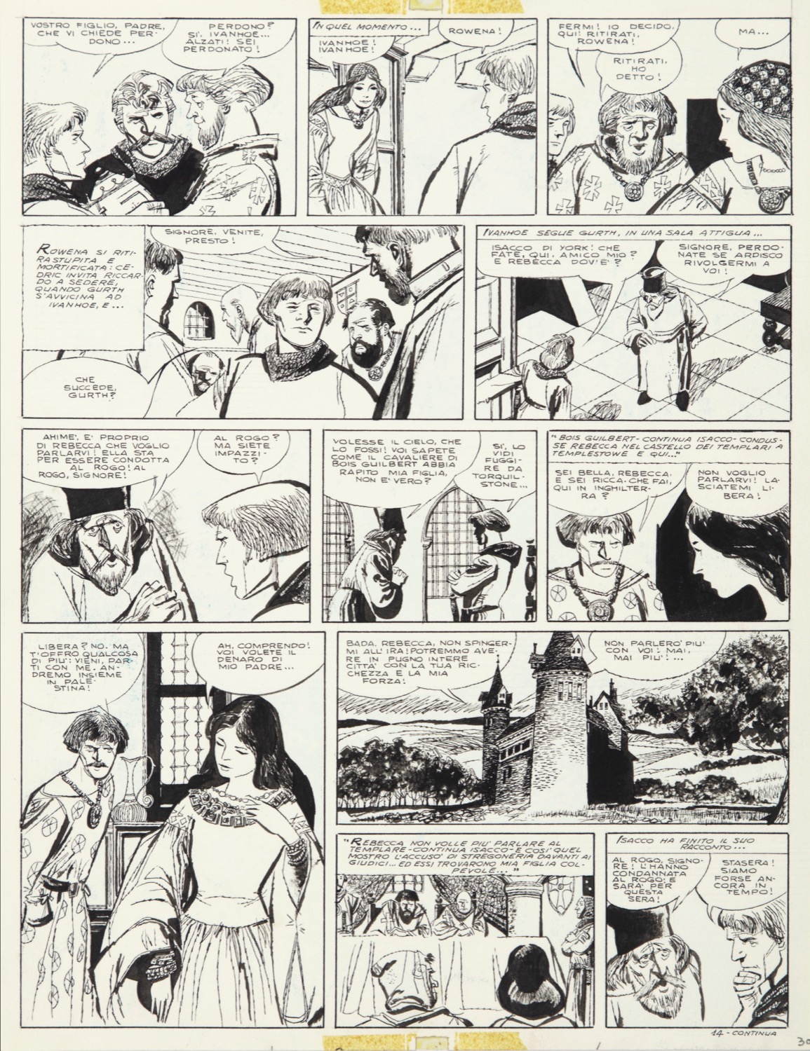 Tavola originale realizzata da Battaglia per la pag. 30 di "Ivanhoe", adattamento a fumetti del classico di Walter Scott edito per la prima volta nel 1965 e successivamente sul volume I Crociati dalle edizioni Il Gatto e la Volpe nel 1982. Colorata a tempera al retro.