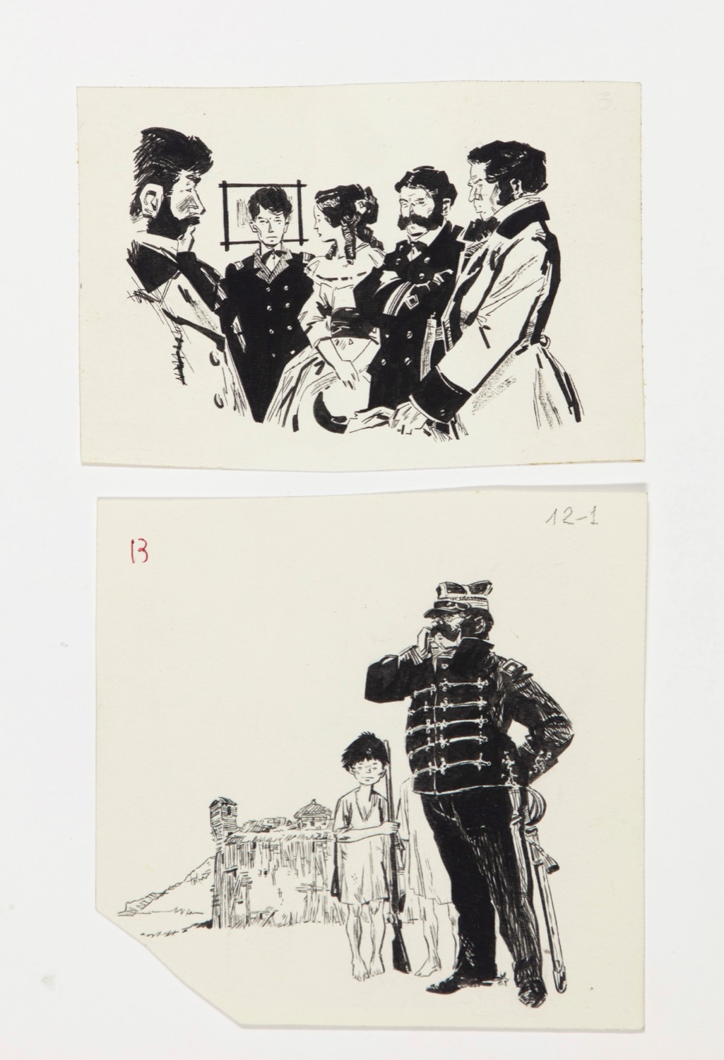 Coppia di 2 vignette originali realizzate da Battaglia per la trasposizione a fumetti de "I figli del capitano Grant" di Jules Verne, edite a puntate su Topolino nel 1958.