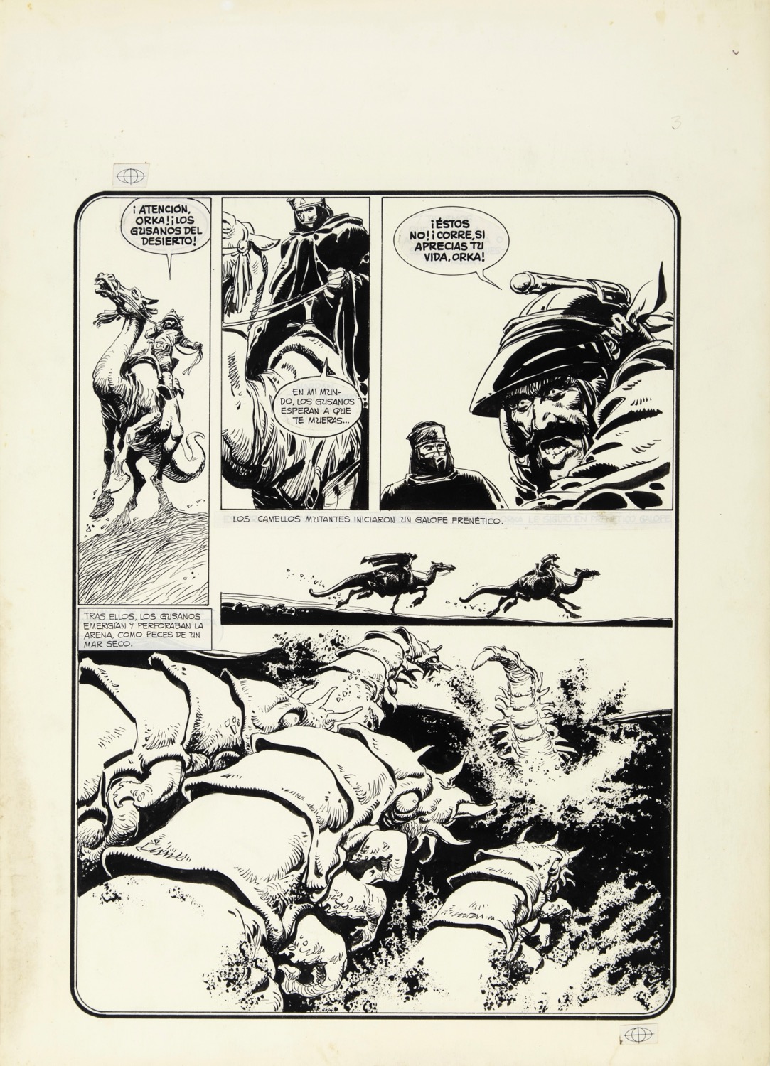 Tavola originale realizzata da Bermejo per "Pyramid of the Black Sun: Orka", edita per la prima volta su Eerie n. 124 a pag. 3 dalla Warren Publishing nel 1981. Tracce di umidità al margine sinistro.