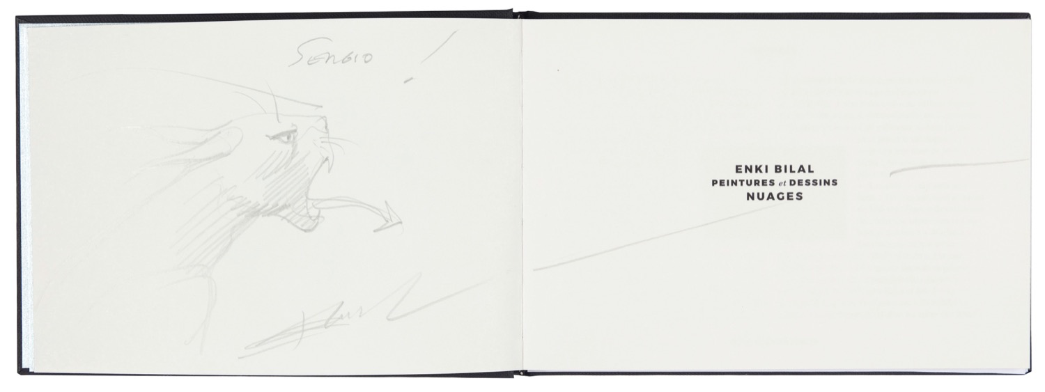 Disegno originare realizzato da Bilal sul frontespizio del catalogo della mostra "Enki Bilal: Peintures et Dessins", tenutasi presso la galleria Nuages di Milano nel 2017. Catalogo rilegato in tela nera e stampato in 150 esemplari numerati (nostro esemplare 19/150). Firmato e dedicato.