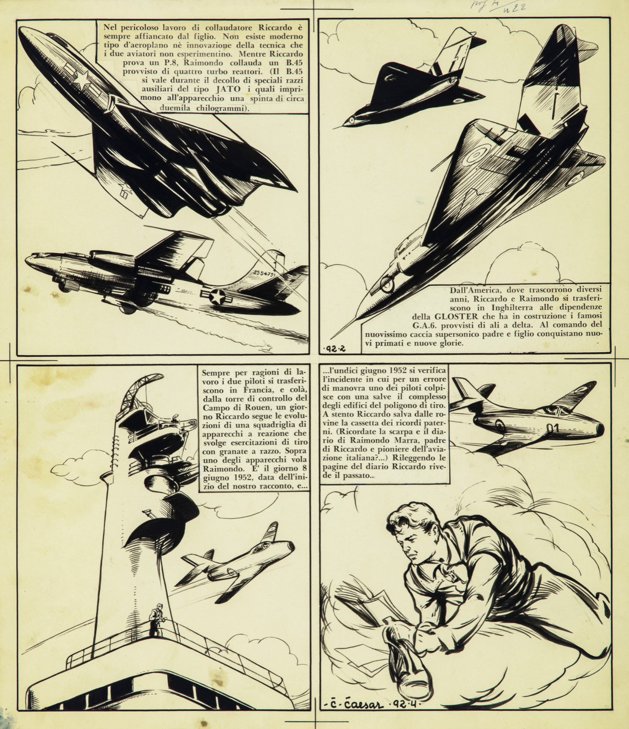 Tavola originale realizzata da Caesar per una delle sue celebri avventure nei cieli edita sulle pagine de Il Vittorioso nei primi anni '40. Acquerellata al retro. Firmata.
