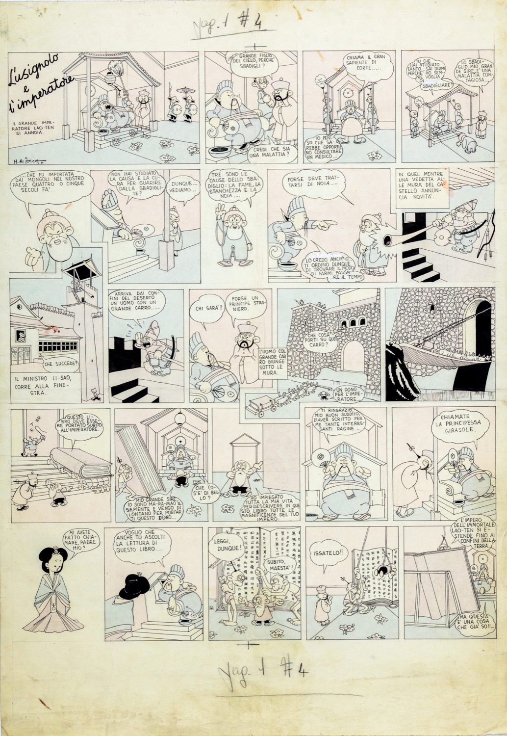 Tavola originale realizzata da Iocca per la pag. 1 de "L'usignolo e l'imperatore" del 1950. Iocca è celebre per essere stato l'autore della segnaletica del Codice della strada italiano. Acquerellata al retro. Firmata e datata.