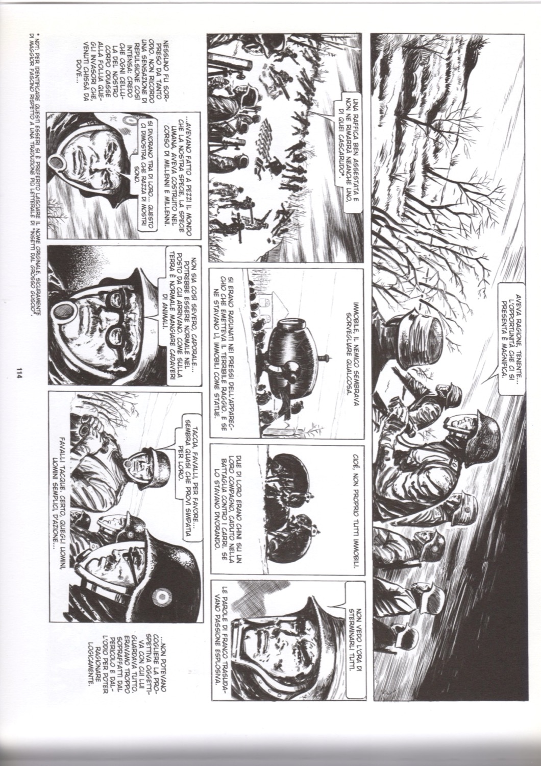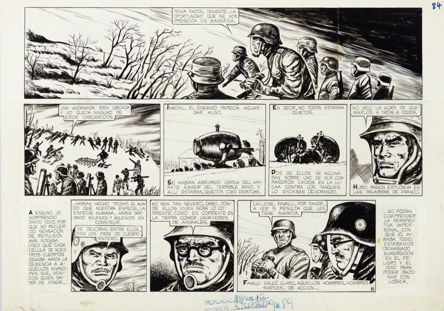 Tavola originale realizzata da Lopez per il suo capolavoro "L'Eternauta", edita per la prima volta sul supplemento del periodico Hora Cero Semanal n. 23 nel 1957. Pag. 85 della saga creata da Héctor Oesterheld, divenuta una delle pietre miliari del fumetto moderno. Una pagina di grande pathos dove un manipolo di soldati si prepara ad attaccare l'invasore alieno e dove i due protagonisti Franco e Favalli ci fanno riflettere sulla tragica situazione della razza umana. Metafora e tragico anticipatore della situazione politica argentina che da li a poco sfocerà nella dittatura, L'Eternauta è divenuto un simbolo di rivolta civile e di indipendenza intellettuale, che costò la vita al suo autore quando nell'aprile del 1977 Oesterheld fu prelevato da uno Squadrone della Morte entrando così a far parte della numerosa schiera dei desaparecidos argentini. Lievi pieghe.