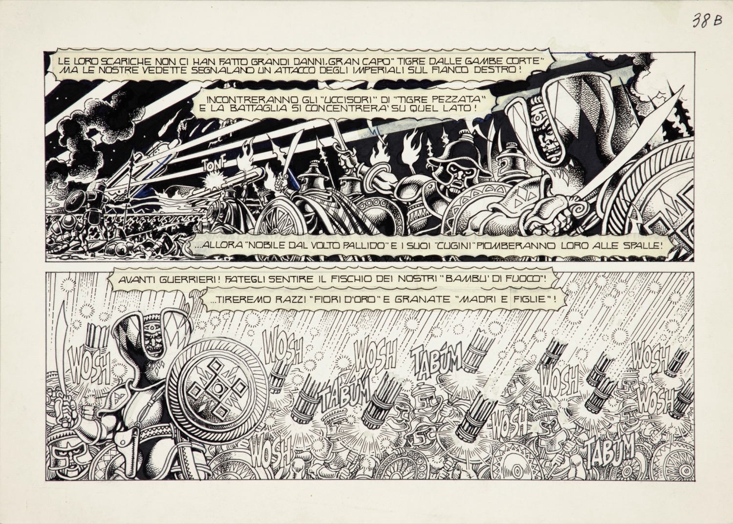 Tavola originale realizzata da Magnus per "Governanti e rivali" contenuta nell'Atto IV de I Briganti a pag. 38 e pubblicata per la prima volta a episodi sulla rivista Comic Art nel 1989. Un'opera che accompagna il maestro bolognese lungo la maggior parte della sua carriera, dal 1973 fino alla sua scomparsa, facendo si che lo stile grafico cambi nel tempo seguendo la sua evoluzione stilistica. Ispirandosi ad un romanzo cinese del XIII secolo, Magnus sviluppa il racconto in maniera fantascientifica: si ispira a Flash Gordon e a Saturno contro la terra, passa dal medioevo futuro alle astronavi spaziali, in una ambientazione esotica e fiabesca mescola elementi realistici e tecnologici, unisce Oriente e Occidente.