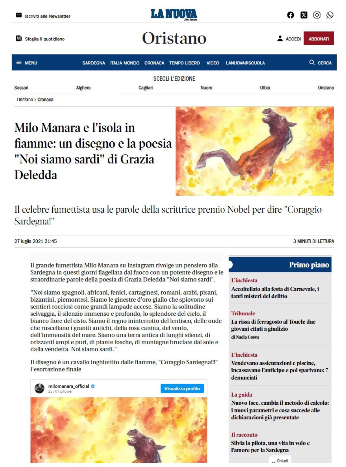 Illustrazione originale realizzata da Manara, a corredo di una poesia di Grazia Deledda, per rendere omaggio alla Sardegna quando nell'estate del 2021 fu devastata da una serie di incendi. L'opera è stata più volte pubblicata online e su vari quotidiani locali. Firmata.