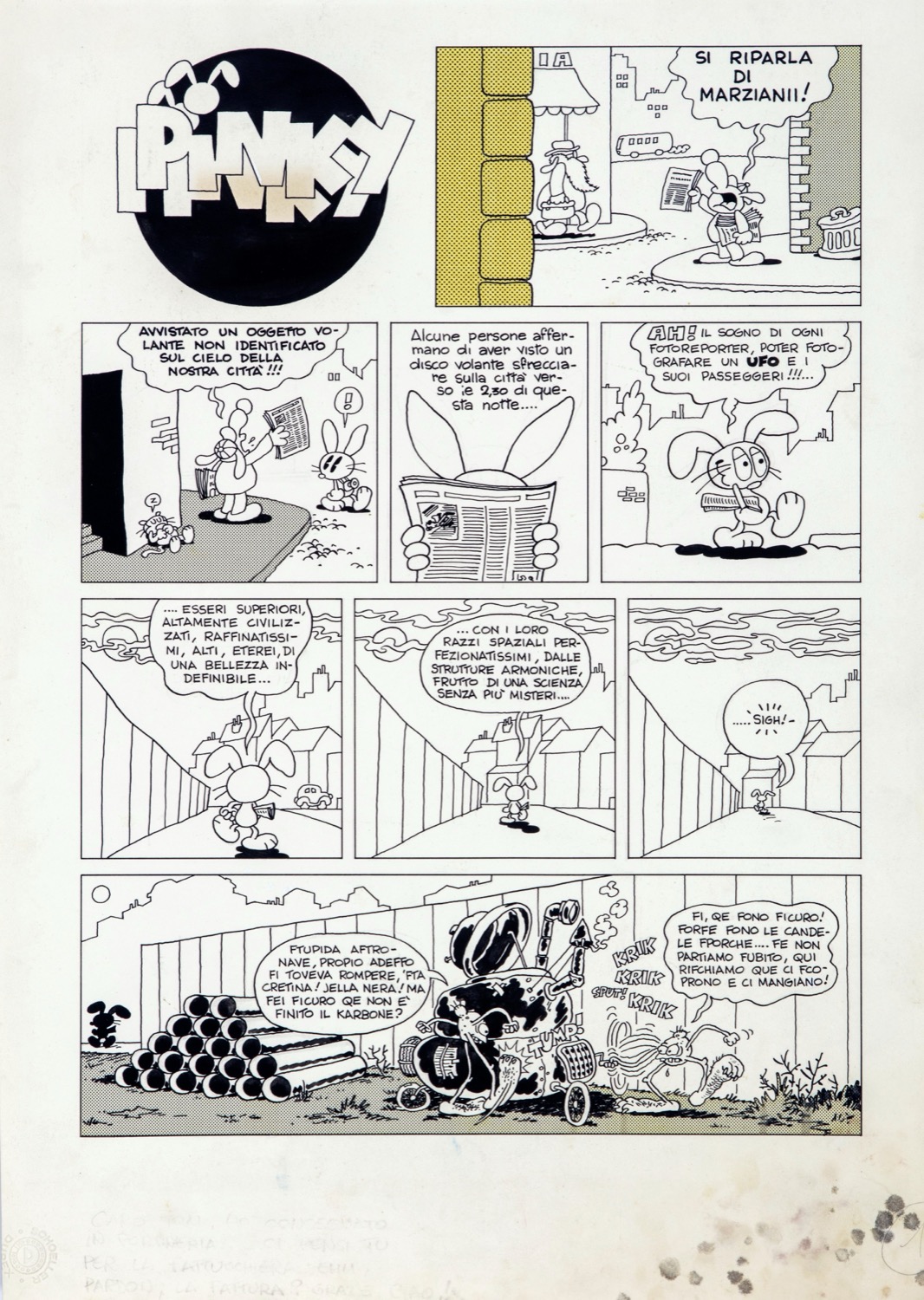 Tavola originale autoconclusiva realizzata da Mattioli per la prima avventura di Pinky della serie "UFO", edita su Il Giornalino n. 26 dalle Edizioni San Paolo nel 1976. Apparsa per la prima volta nel 1973, "Pinky" è il personaggio più celebre di Mattioli, è infatti con substrato di follia e gusto dell'assurdo di Pinky che prendono vita i lavori più maturi del maestro romano. Lieve traccia di umidità all'angolo inferiore destro.