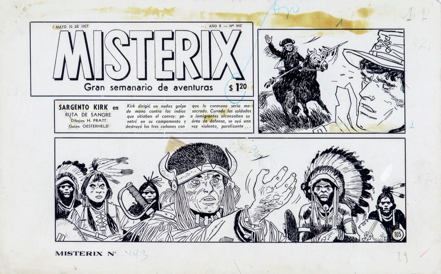 Tavola originale realizzata da Pratt per "Sentiero di sangue", pag. 105 dell'avventura de Il Sergente Kirk pubblicata per la prima volta in Argentina con il titolo "Ruta de sangre" sulla copertina della rivista Misterix n. 443 dall'Editorial Abril nel 1957, ristampata in Italia nella versione integrale su "Sgt. Kirk Vol. V" a pag. 78 dalla Rizzoli-Lizard nel 2020. Fori all'angolo superiore sinistro e piccolo strappo al margine inferiore. Il titolo è stampato.