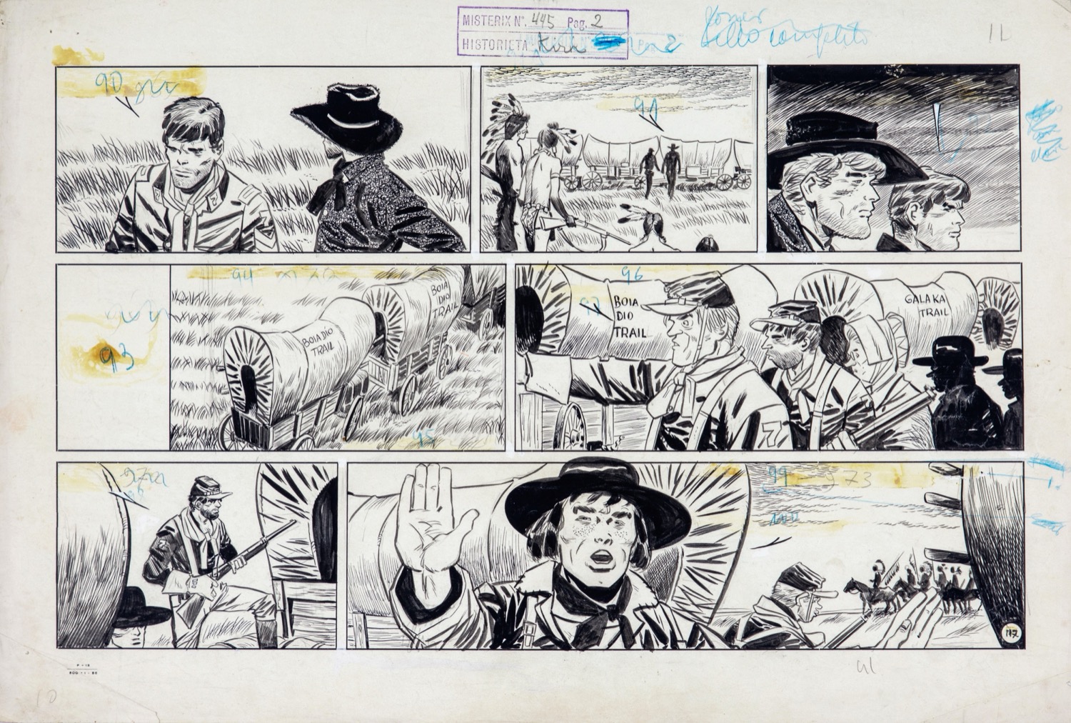 Tavola originale realizzata da Pratt per "Sentiero di sangue", pag. 117 dell'avventura de Il Sergente Kirk pubblicata per la prima volta in Argentina con il titolo "Ruta de sangre" su Misterix n. 445 a pag. 2 dall'Editorial Abril nel 1957, ristampata in Italia nella versione integrale su "Sgt. Kirk Vol. V" a pag. 84 dalla Rizzoli-Lizard nel 2020. Lievi pieghe ai margini e fori di affissione all'angolo superiore sinistro.