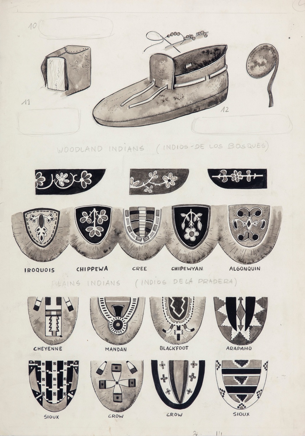Tavola originale realizzata da Gisela Dester, collaboratrice e compagna di Pratt durante la sua permanenza in Argentina, per "El mundo de Ticonderoga", pubblicata per la prima volta sulla rivista Frontera Extra n. 31 dall'Editorial Frontera nel 1960. Questa serie di tavole, che fungevano da appendice storica alle storie di Ticonderoga Flint, furono pubblicate in Italia (attribuendo i disegni a Hugo Pratt) nel volume "Ticonderoga" dalle edizioni Il gatto e la volpe nel 1981. Lievi pieghe e piccoli strappi ai margini.