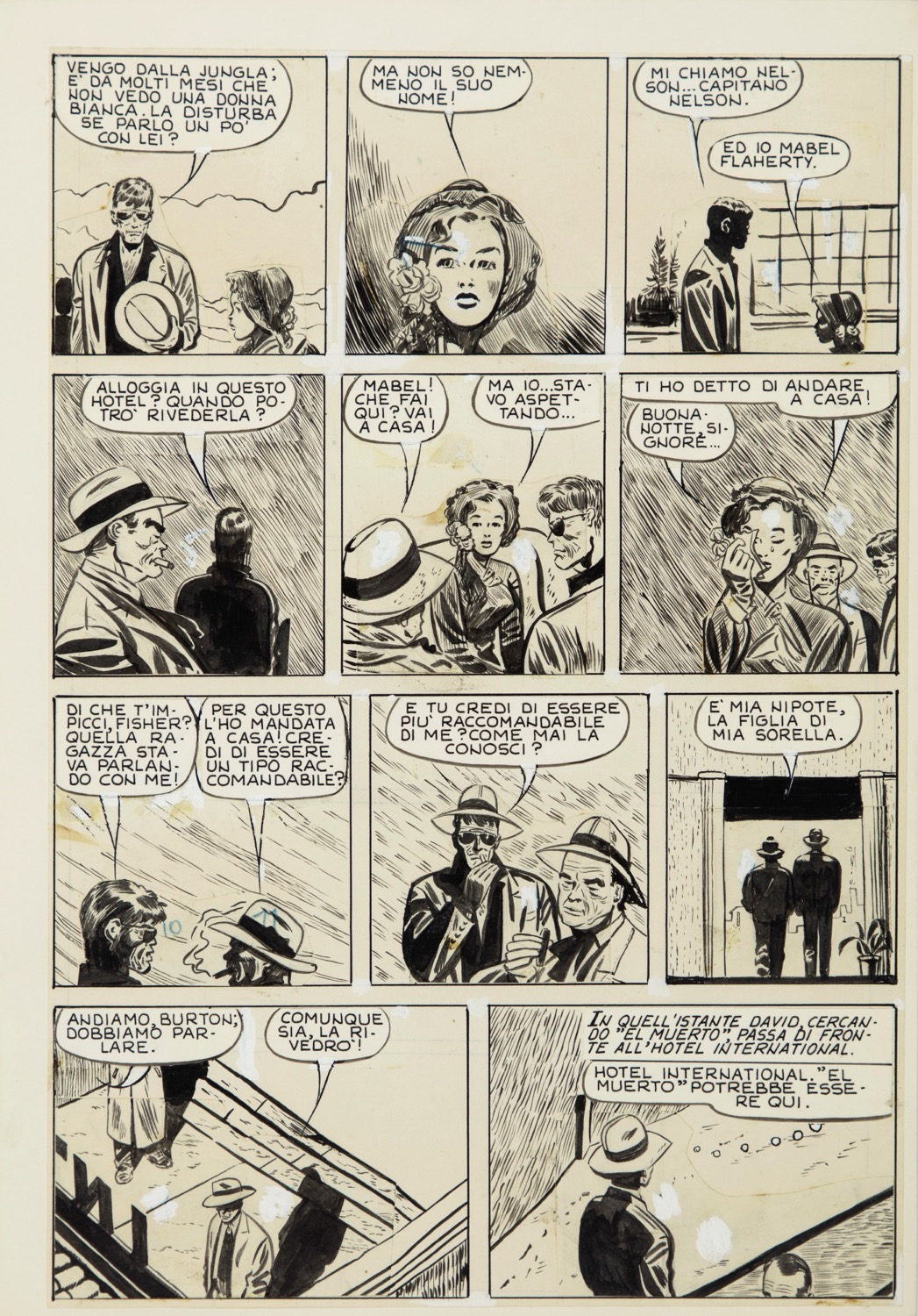 Tavola originale realizzata da Pratt per "Junglemen", pag. 188 di questa lunga serie ambientata nelle esotiche regioni oceaniche della Nuova Guinea orientale e Nuova Caledonia, pubblicata per la prima volta nel 1950 sul settimanale argentino Salgari e successivamente rimontata dallo stesso Pratt (durante la sua permanenza in Argentina) per le pagine del settimanale Misterix n. 748 del 1963. In Italia fu pubblicata sulla rivista Sgt. Kirk tra il 1968 e 1969. Un vero e proprio romanzo corale per immagini nato dal genio di Alberto Ongaro e dal pennino di Dino Battaglia (che ne disegnò le prime 25 tavole per gli Albi Uragano) e successivamente ripreso e plasmato da un giovane Hugo Pratt, diventando per lui un importante punto di partenza per la sua sfolgorante carriera. " E' la più bella storia che ricordo nei fumetti, così importante che ha influenzato tante altre avventure. " (H. Pratt).