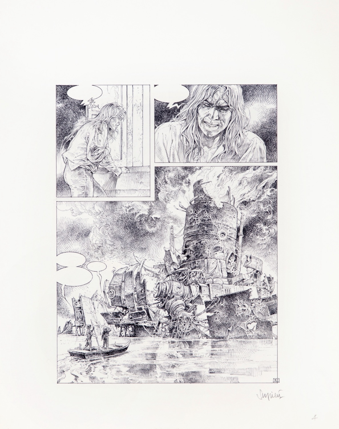 Tavola originale realizzata da Serpieri per il primo volume di Saria "Le tre chiavi", edita a pag. 32 dalla casa editrice francese Delcourt nel 2012. Il segreto di tre chiavi che aprono le porte dell'oltretomba, l'avventura di una ragazza tra le calli di una Venezia magica e futuristica, braccata dalle squadracce di un duca con i lineamenti sinistri di Mussolini e seguita dagli sguardi di un doge robotico e spietato e di un angelo sanguinario: questa è la storia di Saria che uscì per la prima volta nel 2007 in Francia per l'editore Laffont con il titolo di "Les Enfers" e da allora ha segnato indiscutibilmente uno dei punti più alti della carriera artistica del maestro veneziano. Firmata.
