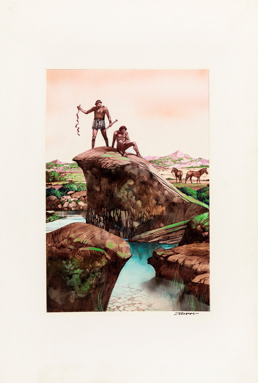 Illustrazione originale realizzata da Toppi per il romanzo fantasy storico "La valle dei cavalli" di Jean M. Auel, edito nella Selezione del Reader's Digest nel 1989. Lieve piega all'angolo superiore destro. Firmata.