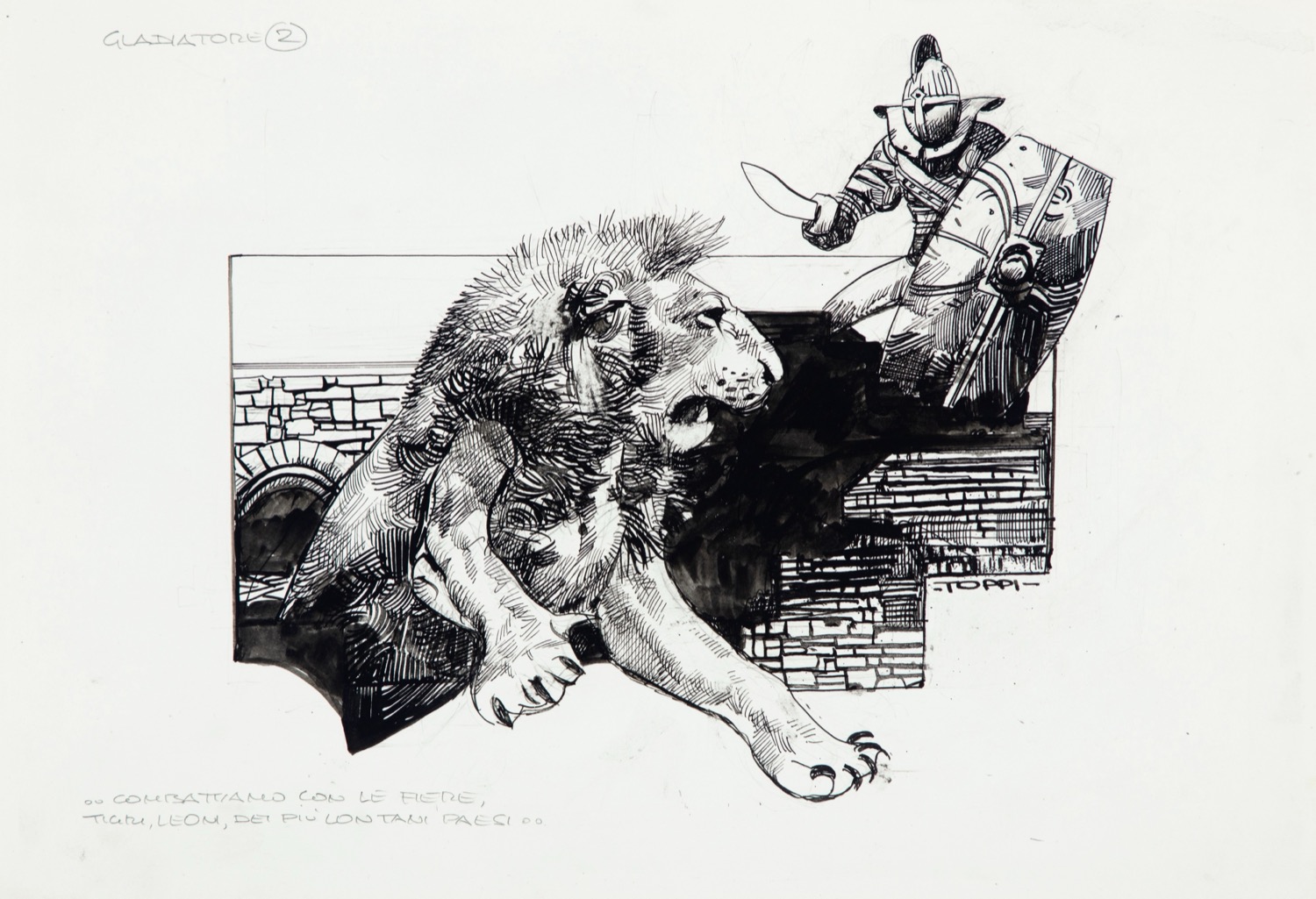 Illustrazione originale realizzata da Toppi negli anni ‘80 per l'inserto Conoscere Insieme edito su Il Giornalino. " …combattiamo con le fiere, tigli, leoni, dei più lontani paesi… " Firmata.
