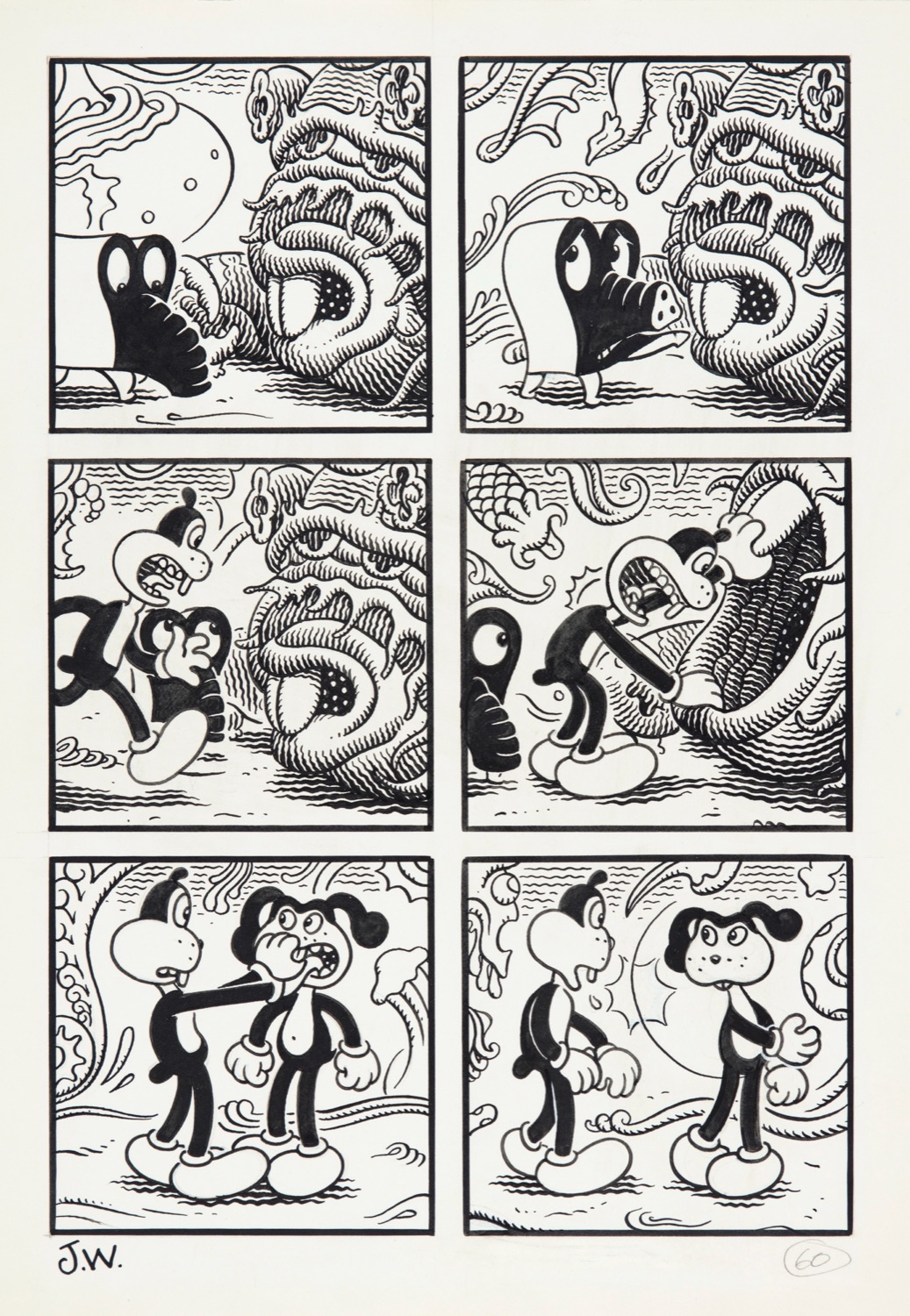 Tavola originale realizzata da Woodring per la graphic novel "Fran", edita dalla Fantagraphics Books nel 2013. Personaggi antropomorfi, paesaggi surreali e atmosfere oniriche sono il frutto del genio delle allucinazioni del maestro americano. Firmata.