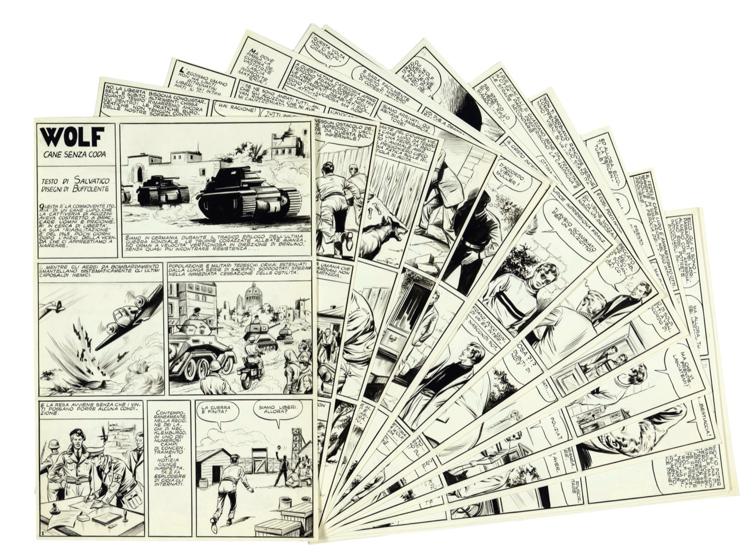 Storia completa composta da 18 tavole originali realizzate dalla Buffolente per "Wolf: cane senza coda", storia pubblicata sugli Albi del Vittorioso nei primi anni '50. Firmata nell'ultima pagina.