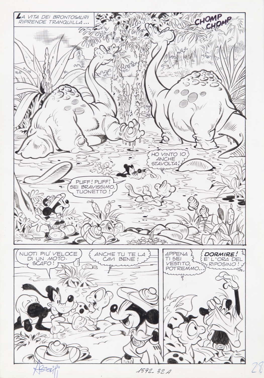 Tavola originale realizzata da Asteriti per "Topolino e il mistero dei dinosauri", edita su Topolino n. 1592 a pag. 28 nel Giugno 1986. Firmata.