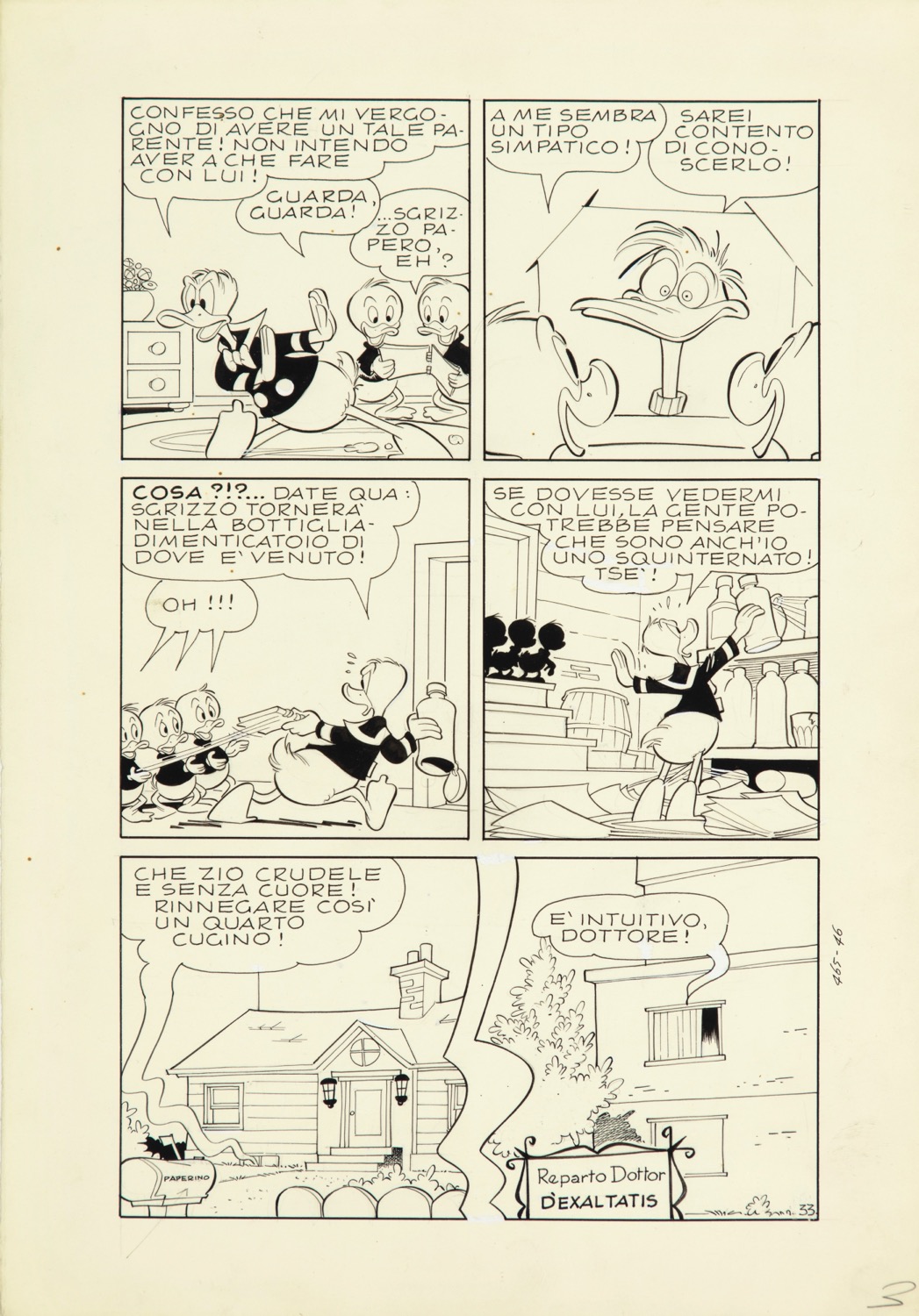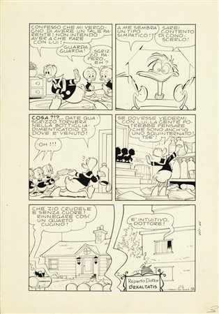 Tavola originale realizzata da Scarpa per "Sgrizzo il più balzano papero del mondo" edita su Topolino n. 465 a pag. 3 nell'ottobre 1964. Prima apparizione del folle cugino di Paperino, personaggio nato dalla matita di Scarpa, qui pronto a irrompere nella vita dei suoi sfortunati cugini. Chine di Giorgio Cavazzano. Di grande rarità.
