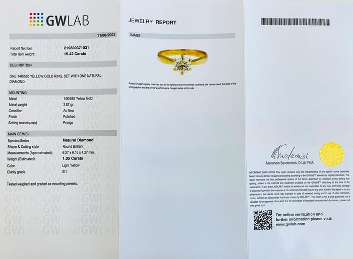 ANELLO IN ORO GIA - NUMERO DI REPORT INCISO SULLA CORANALLO 14K 3.08 GR CON DIAMANTI PER 1.03 CARATI COLORE LIGHT YELLOW SI1 TAGLIA 6.5 CERTIFICATO GW - RNG10606