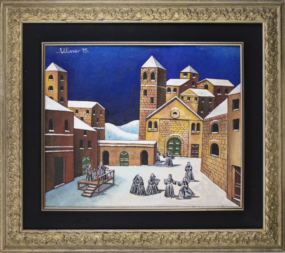 ULISSE (n. 1957) FESTA DI PIAZZA. 1995. Olio su tavola. Cm 59,50 x 49,00. firma e data
