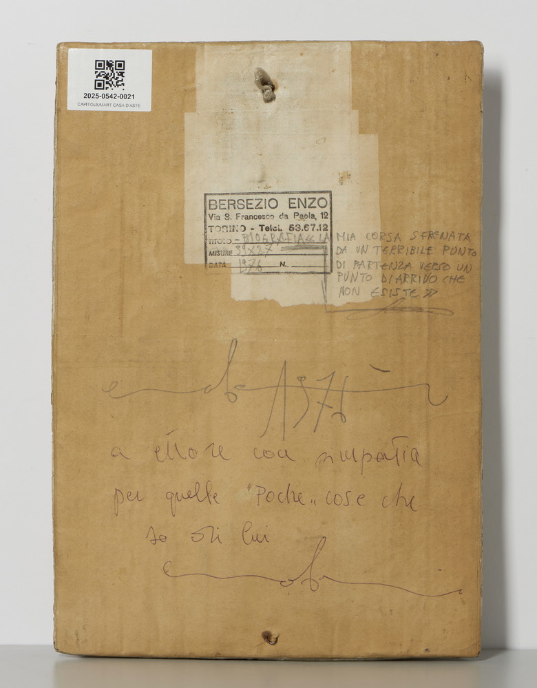 BERSEZIO ENZO (n. 1943) BIBLIOGRAFIA: LA MIA CORSA SFRENATA DA UN TERRIBILE PUNTO DI PARTENZA VERSU UN PUNTO DI ARRIVO CHE NON ESISTE. 1976. scultura. Cm 27,00 x 39,00. sul retro: firma, anno, titolo, dedica ad personam e timbro dell'artista
