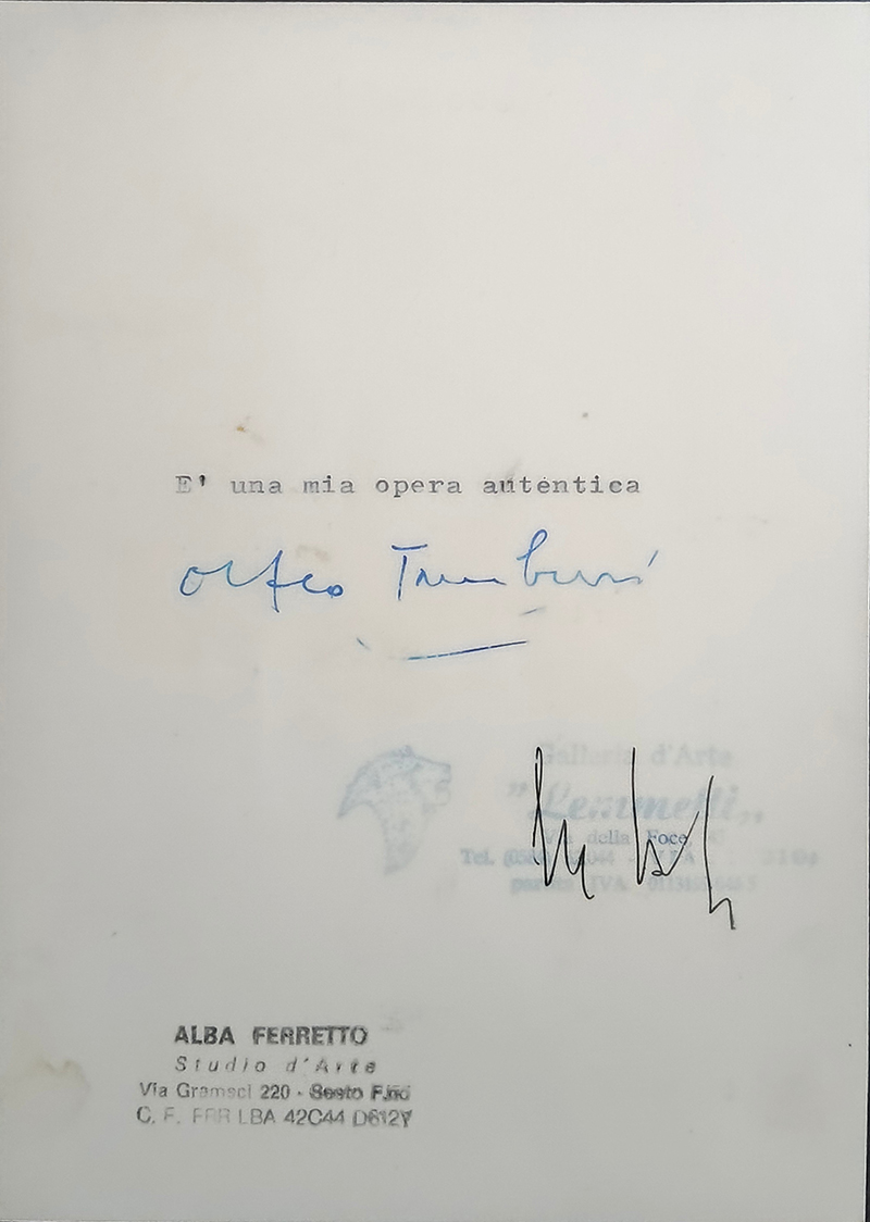Autentica dell'artista su foto e timbro di Alba Ferretto. Firmato fronte opera. Etichetta Fabiani Arte sul retro