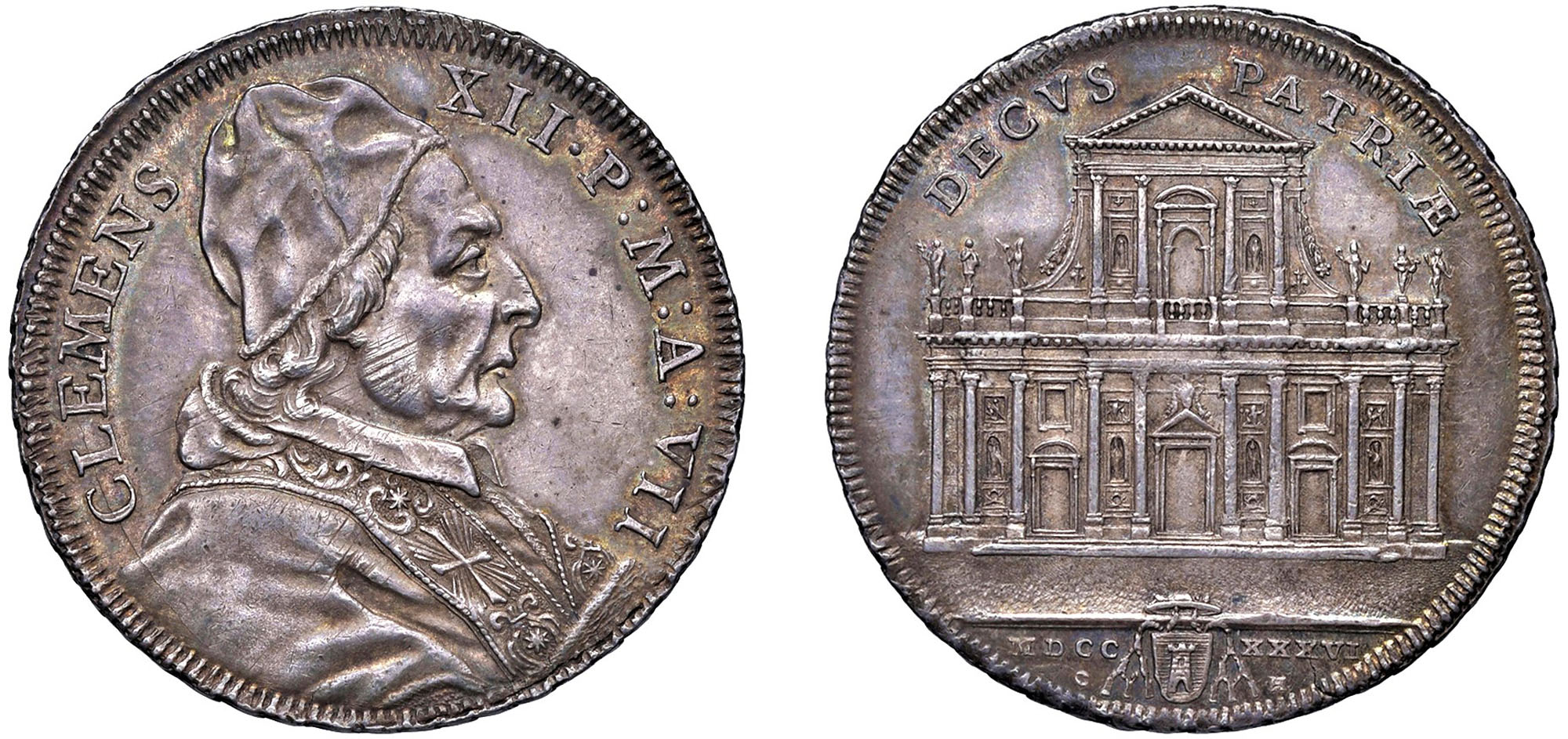 CLEMENTE XII, Lorenzo Corsini (1730-1740) - Mezza piastra, an. VII, Roma.Argento, 14,80 gr. - Diam. 36 mm.Dritto: Busto a destra con camauro, mozzetta e stola ornata di croce raggiante e stelle entro rabeschi; - Rovescio: Facciata della Chiesa di San Giovanni dei Fiorentini in Roma.MIR 2495/1, Muntoni 19 RaraMagnifico esemplare con patina iridescente su fondi lucenti.SPL-FDCAl di là del Tevere, nei pressi di Ponte Sant'Angelo, sorgeva il quartiere dei Banchi, così chiamato perché vi risiedevano i cambiavalute, che esercitavano la professione all'aperto, su appositi banchi, dove erano disposti gli abachi per fare di conto, le bilance per le monete e tutto l'occorrente per la loro attività. Non a caso, Giulio II (1503-1513) aveva voluto che il nuovo palazzo della Zecca sorgesse proprio al centro del quartiere.I cambiavalute, per lo più fiorentini, chiesero al pontefice Leone X, esponente della famiglia Medici, di poter erigere una chiesa dedicata a San Giovanni Battista, patrono di Firenze. I lavori iniziarono intorno al 1517, ma si protrassero per decenni, con un continuo ampliamento della struttura. Sotto il pontificato di Clemente XII, si giunse all'innalzamento della facciata, la cui realizzazione fu affidata ad Alessandro Galilei (1691-1737) e i cui lavori vennero ultimati nel 1734.In seguito alla recessione economica vissuta nel periodo, furono necessari drastiche misure finanziarie, che riguardarono sia l'Erario che la stessa Zecca, con particolare attenzione alla coniazione dei nominali in argento (cit. L. Londei & S. Balbi De Caro, 'Moneta pontificia, da Innocenzo XI a Gregorio XVI', pp. 58 sgg.). Per accelerare la coniazione del circolante, data la limitata capacità della zecca di Santa Marta, la Camera Apostolica stipulò un contratto con i fratelli Ermenegildo e Ottone Hamerani, che si impegnarono a coniare monete d'argento nella loro officina in via dei Coronari.Nel 1734, agli Hamerani venne conferita l'esclusiva della 'virola', strumento utile per impedire la tosatura delle monete. Questo tipo di lavorazione perfezionò le monete dal punto di vista tecnico e le rese più sicure in termini di peso, ma costrinse gli Hamerani ad acquistare nuovi macchinari e ad ingrandire la propria officina. Per quanto riguarda la moneta in oggetto, fu il solo Ottone a incidere questa moneta, poiché il fratello Ermenegildo, da qualche anno, non si occupava più materialmente delle realizzazioni di monete e medaglie, ma si concentrava sull'amministrazione dell'azienda.