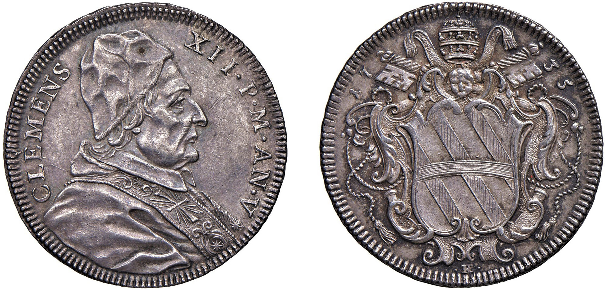 CLEMENTE XII, Lorenzo Corsini (1730-1740) - Testone, an. V, Roma.Argento, 8,42 gr. - Diam. 31 mm.Dritto: Busto a destra con camauro, mozzetta e stola ornata di croce raggiante e stelle entro rabeschi; - Rovescio: Stemma a doppia targa, con testa di cherubino in alto, con fogliami e volute, sormontato da triregno e chiavi decussate.MIR 2500/1, Muntoni 58 RaroDi ottima qualità.SPL/q.FDCProveniente dall'importante 'Collezione di monete e medaglie papali' messa all'incanto nell'asta Negrini 44 del 19 aprile 2018, lotto 888.