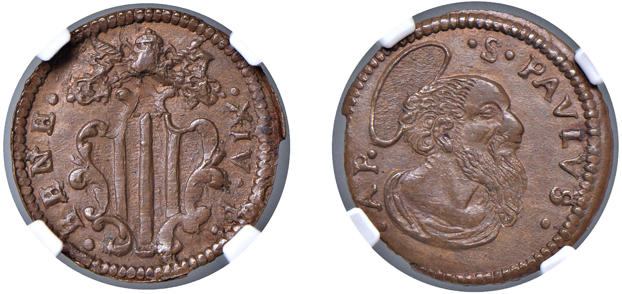 BENEDETTO XIV, Prospero Lorenzo Lambertini (1740-1758) - Quattrino, s.d., Gubbio.Rame - n.d.Dritto: Stemma sormontato da triregno su chiavi decussate; - Rovescio: Busto di San Paolo nimbato a destra.MIR 2660/10, Muntoni 519 Non comuneDi ottima qualità.Sigillato NGC MS64 BN.Certificato NGC n. 3590444-005.