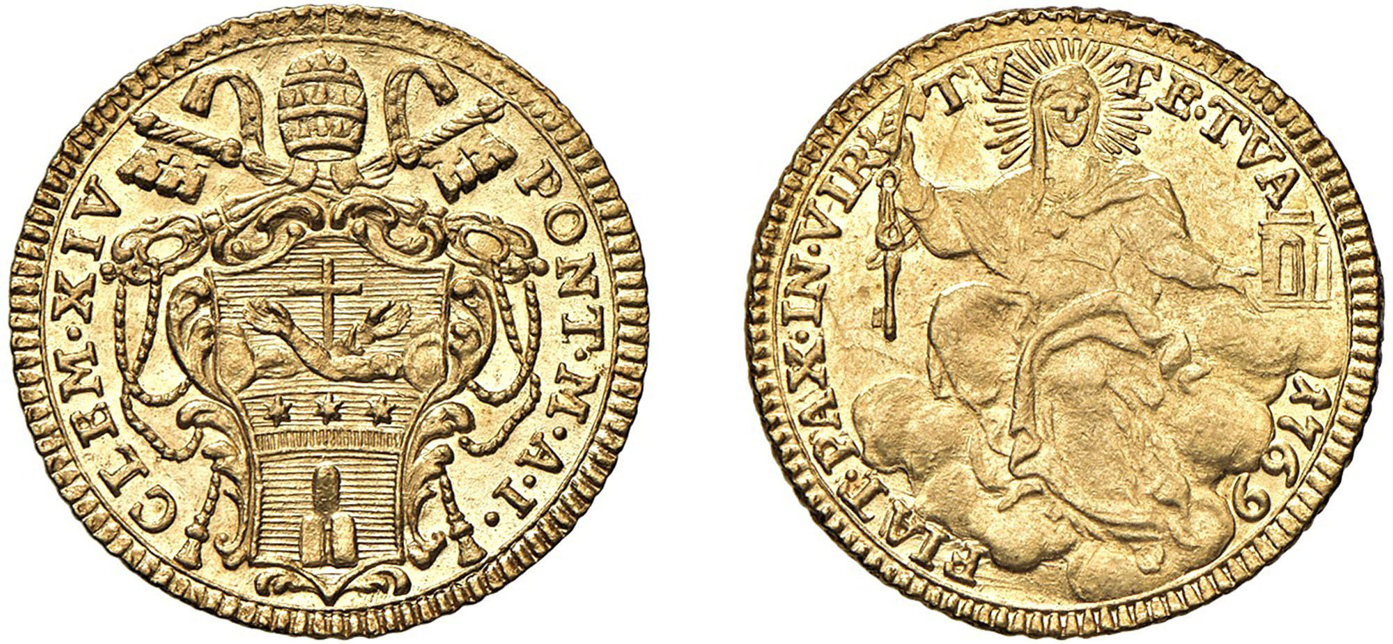 CLEMENTE XIV, Giovanni Vincenzo Antonio Ganganelli (1769-1774) - Zecchino, an. I, Roma.Oro, 3,43 gr. - Diam. 21 mm.Dritto: Stemma a targa poligonale, con fogliami, sormontato da triregno e chiavi decussate; - Rovescio: La Chiesa, col capo velato e raggiante, seduta su nubi, tiene nella destra le chiavi e con la sinistra il tempio a cupola con globetto.MIR 2735/1, Muntoni 1 Non comuneBellissimo esemplare dai fondi lucenti.q.FDC