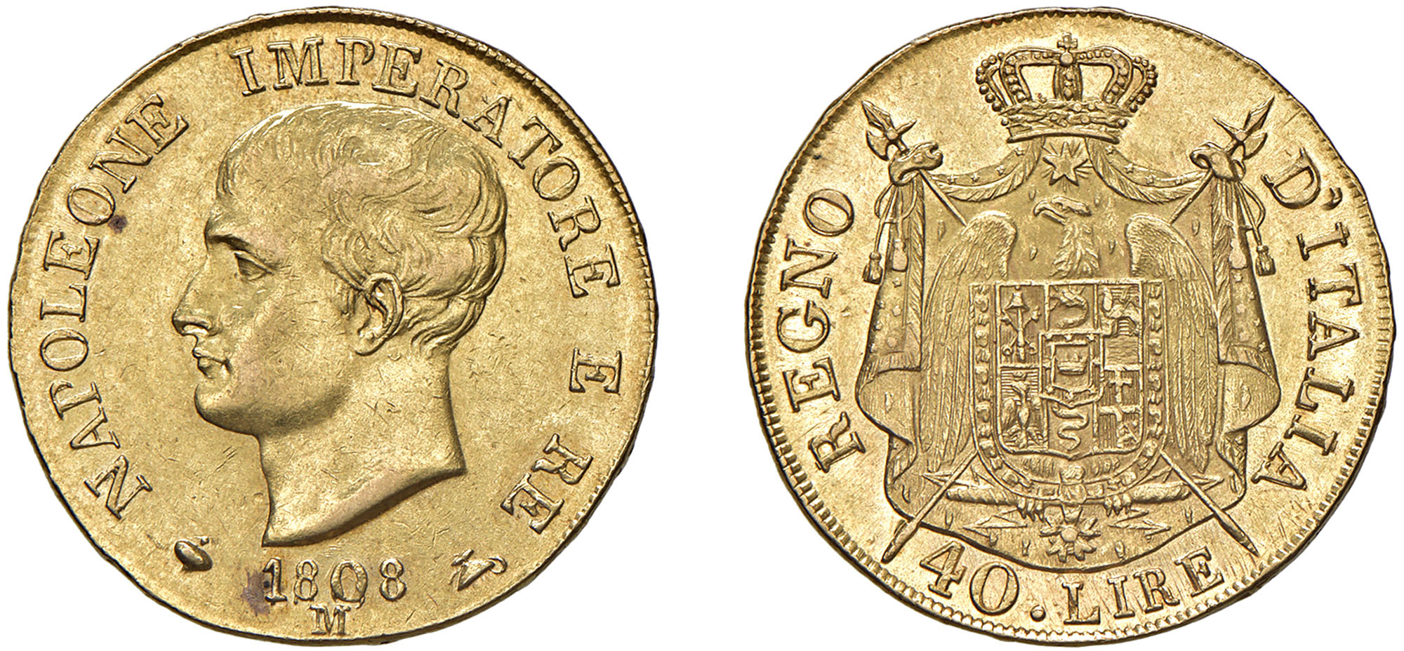 MILANO - NAPOLEONE I, Re d'Italia (1805-1814) - 40 lire 1808, I tipo.Oro, 12,89 gr. - Diam. 26 mm.Dritto: Testa nuda a sinistra; - Rovescio: Stemma coronato su padiglione sorretto da alabarde decussate con puntali aguzzi.Gigante 72Bei fondi lucenti al rovescio.Complessivamente SPL