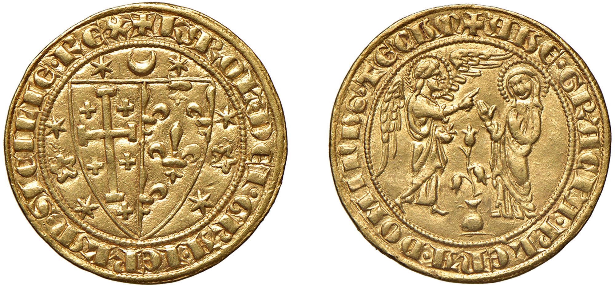 Dritto: Stemma a cuore, bipartito di Gerusalemme e d'Angiò, sormontato da mezza luna e da due stelle; - Rovescio: L'annunciazione della Vergine; interposta, una pianta di giglio.
