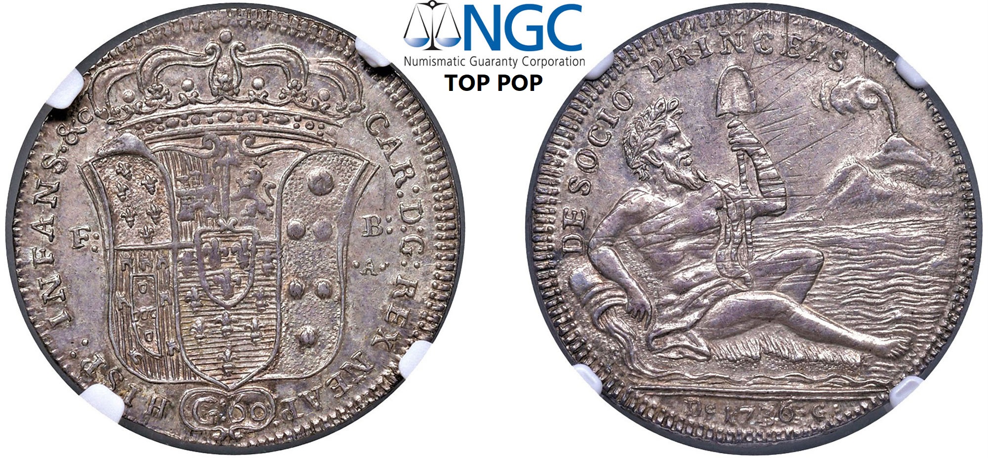NAPOLI - CARLO DI BORBONE (1734-1759) - Mezza piastra da 60 grana, 1736.Argento - n.d.Dritto: Stemma coronato; - Rovescio: Sebeto sdraiato, sullo sfondo il Vesuvio.Gigante 35 RaroMagnifico esemplare di grande freschezza.Sigillato NGC MS63 - TOP POP.Certificato NGC n. 6632615-031.Proveniente dalla prestigiosa 'Collezione Vesuvio', esitata nell'Asta Bolaffi 42, lotto 520.