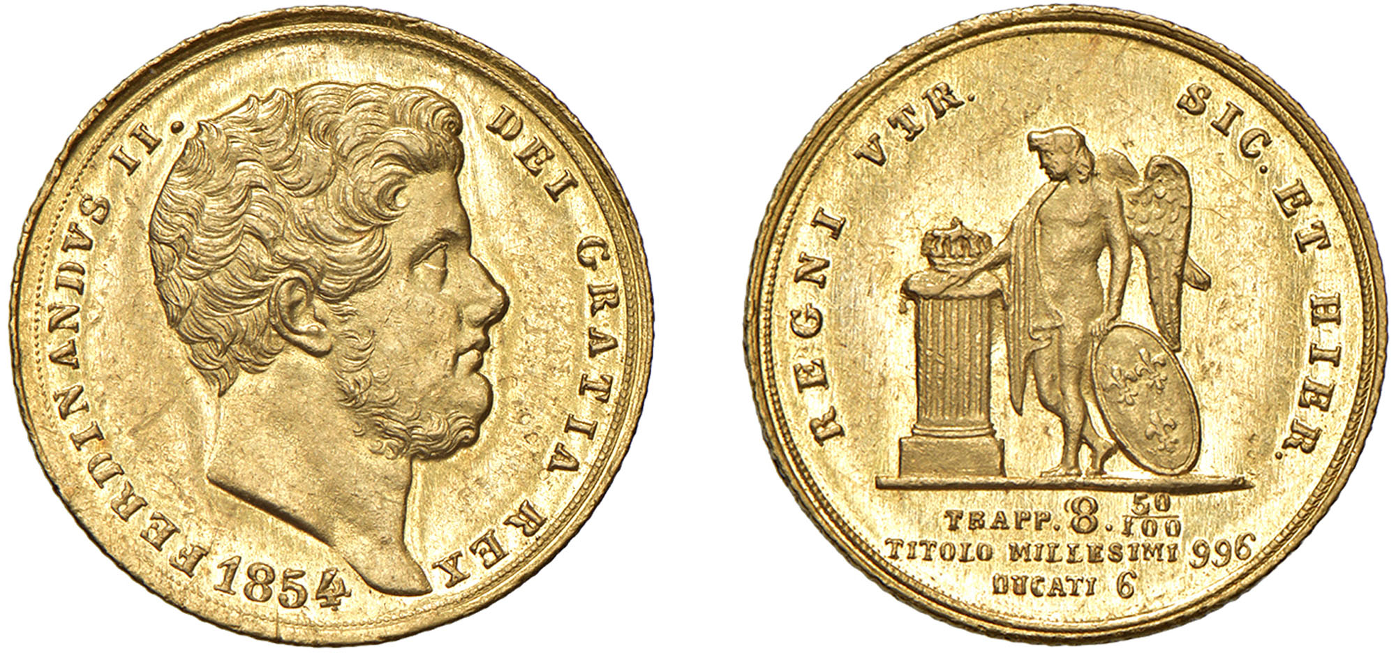 NAPOLI - FERDINANDO II (1830-1859) - 6 ducati 1854, II tipo.Oro, 7,59 gr. - Diam. 21,5 mm.Dritto: Testa nuda, piccola e barbuta, a destra; - Rovescio: Genio alato a sinistra con colonna coronata e scudo.Gigante 37 RarissimoLievi colpetti al bordo al D/, comunque esemplare di ottima qualità per questo raro millesimo.m.SPL/q.FDCSi allega Cartellino De Falco q.FDC