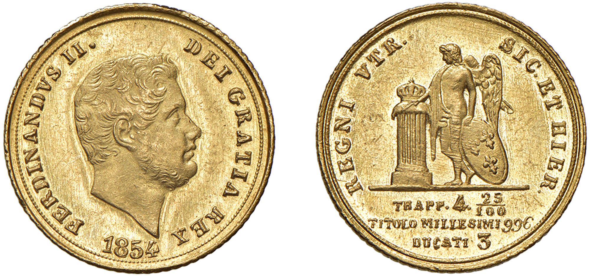 NAPOLI - FERDINANDO II (1830-1859) - 3 ducati 1854, VI tipo.Oro, 3,83 gr. - Diam. 18,5 mm. Dritto: Testa nuda, piccola e barbuta, a destra; - Rovescio: Genio alato a sinistra con colonna coronata e scudo.Gigante 52 q.FDC