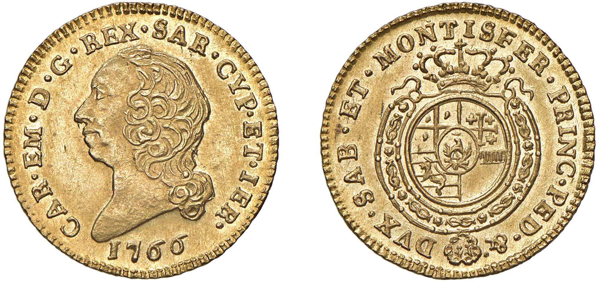 CARLO EMANUELE III, secondo periodo (1755-1773) - ½ doppia 1766, Torino.Oro, 4,82 gr. - Diam. 21 mm.Dritto: Semibusto del Re a sinistra; - Rovescio: Scudo rotondo coronato, con nuova inquadratura, con attorno il Collare dell'Annunziata.Nomisma 140, Cudazzo 1054l Estremamente RaraEsemplare di eccezionale qualità per il tipo di moneta.Praticamente FDC