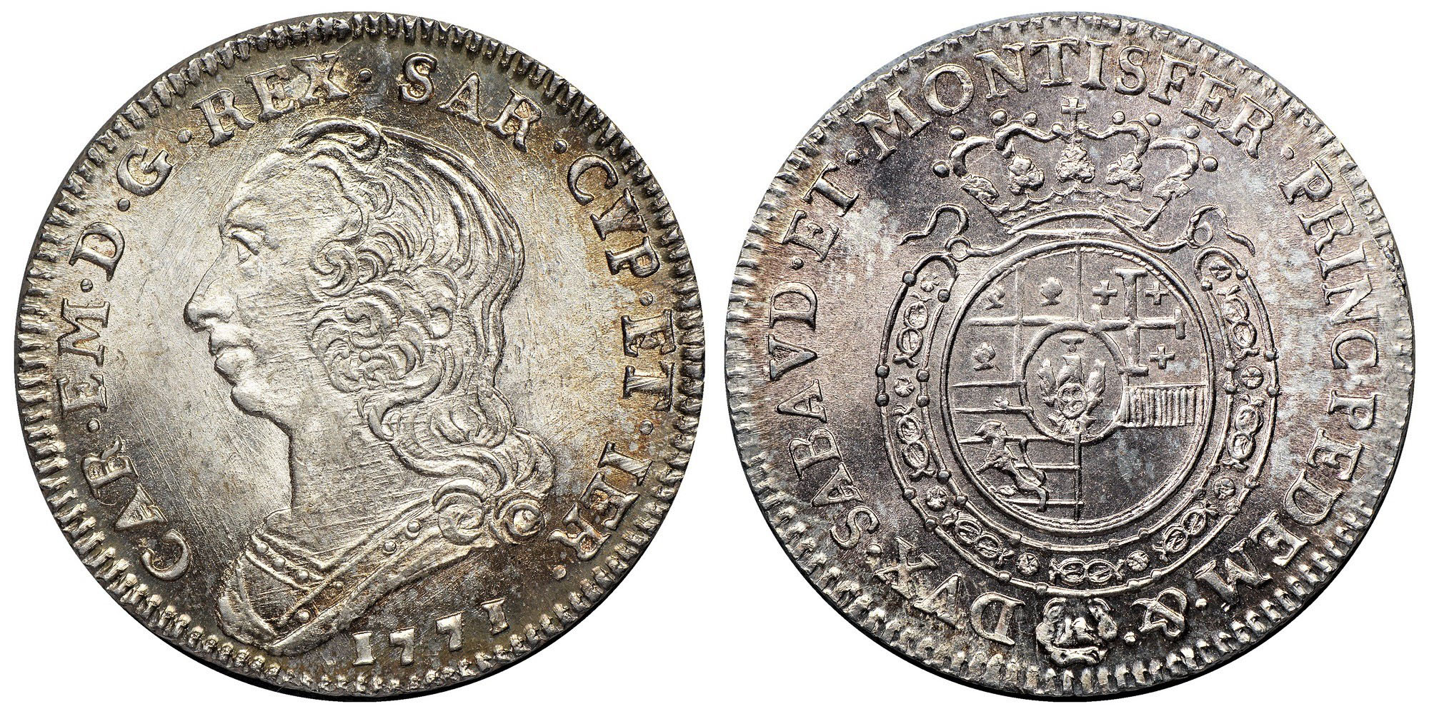 CARLO EMANUELE III, secondo periodo (1755-1773) - ¼ di scudo, 1771, Torino.Argento, 8,83 gr. - Diam. 30 mm. Dritto: Semibusto del Re a sinistra; - Rovescio: Scudo rotondo coronato, con nuova inquadratura, con attorno il Collare dell'Annunziata. Nomisma 193, Cudazzo 1058q Raro Esemplare di eccezionale conservazione. Da ricerche effettuate il miglior esemplare apparso per il millesimo. Un vero gioiello numismatico!FDC