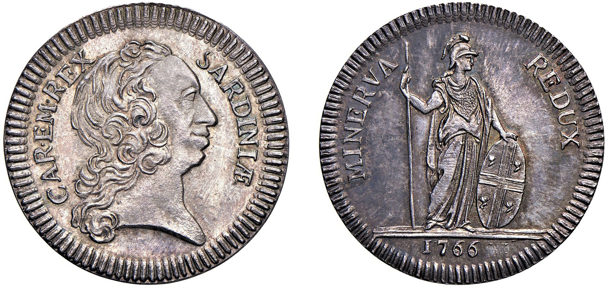 CARLO EMANUELE III, secondo periodo (1755-1773) - Gettone in argento, 1766, Torino.Argento, 8,44 gr. - Diam. 29 mm.Dritto: Testa del Re a destra; - Rovescio: Figura femminile galeata, con asta nella mano destra e poggiata su scudo con la sinistra.Promis 71 Molto raroBell'esemplare con patina di vecchia raccolta.Praticamente FDC