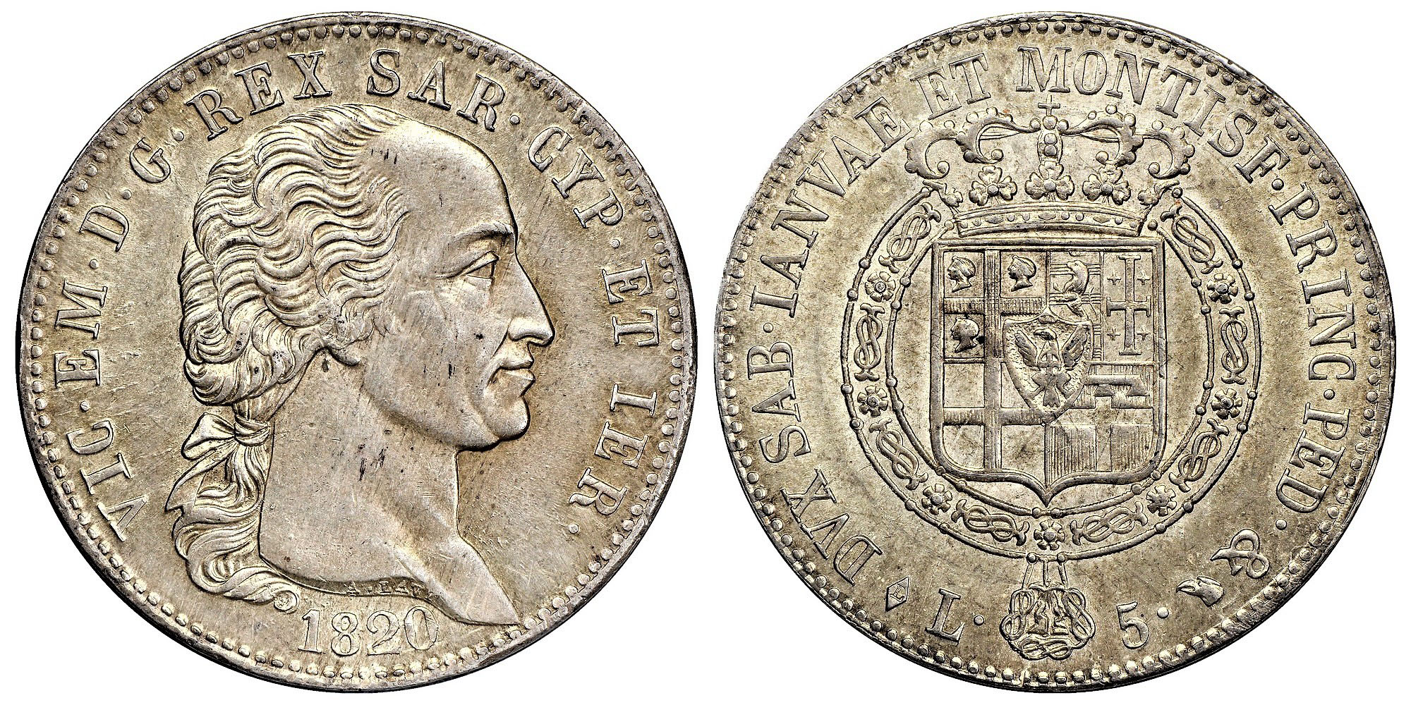 VITTORIO EMANUELE I (1802-1821) - 5 lire 1820, I tipo, Torino.