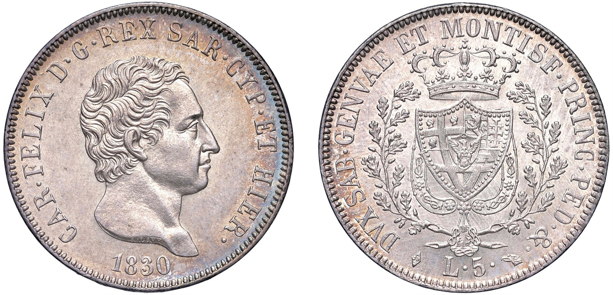 CARLO FELICE (1821-1831) - 5 lire 1830, Torino.Argento, 25,01 gr. - Diam. 37 mm.Dritto: Testa nuda a destra, nel taglio del collo A. LAVY; - Rovescio: Scudo a cuore coronato ed inquartato, con il Collare dell'Annunziata, tra due rami di quercia.Nomisma 573, Gigante 52Esemplare di eccezionale conservazione.Praticamente FDCEx asta Nomisma 62 del 15 e 16 settembre 2020, lotto 1329 - FDC eccezionale con la nota 'Moneta in conservazione straordinaria, priva di difetti, molto rara da reperire in tale qualità'.