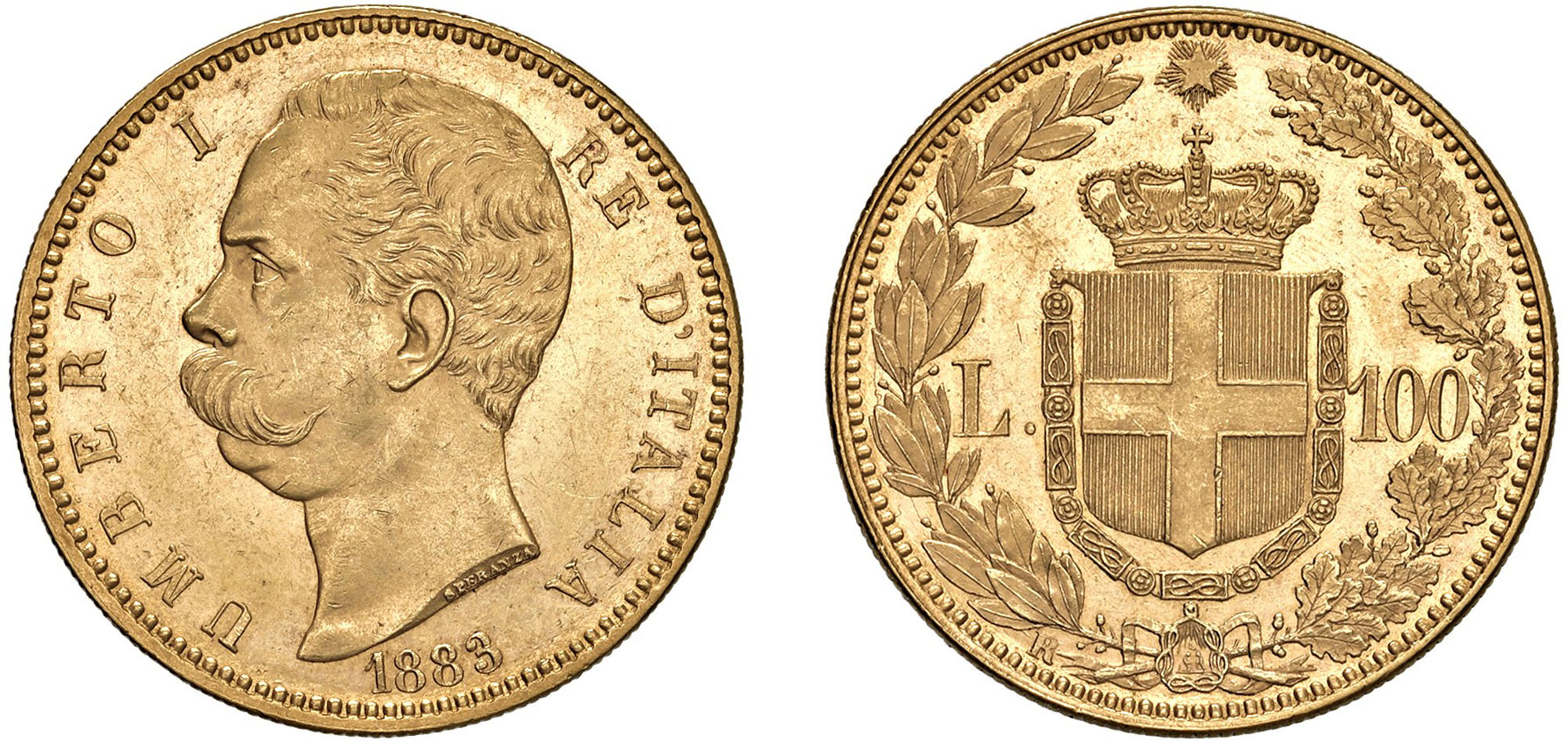 UMBERTO I (1878-1900) - 100 lire 1883, Roma.Oro, 32,30 gr. - Diam. 35 mm. Dritto: testa nuda a sinistra, nel taglio del collo SPERANZA (Filippo Speranza, incisore); - Rovescio: Stemma crociato e coronato, con Collare dell'Annunziata, tra rami di lauro e quercia, in alto una stella raggiante. Nomisma 972, Gigante 3 RaroBellissimo esemplare dai fondi lucenti.q.FDC
